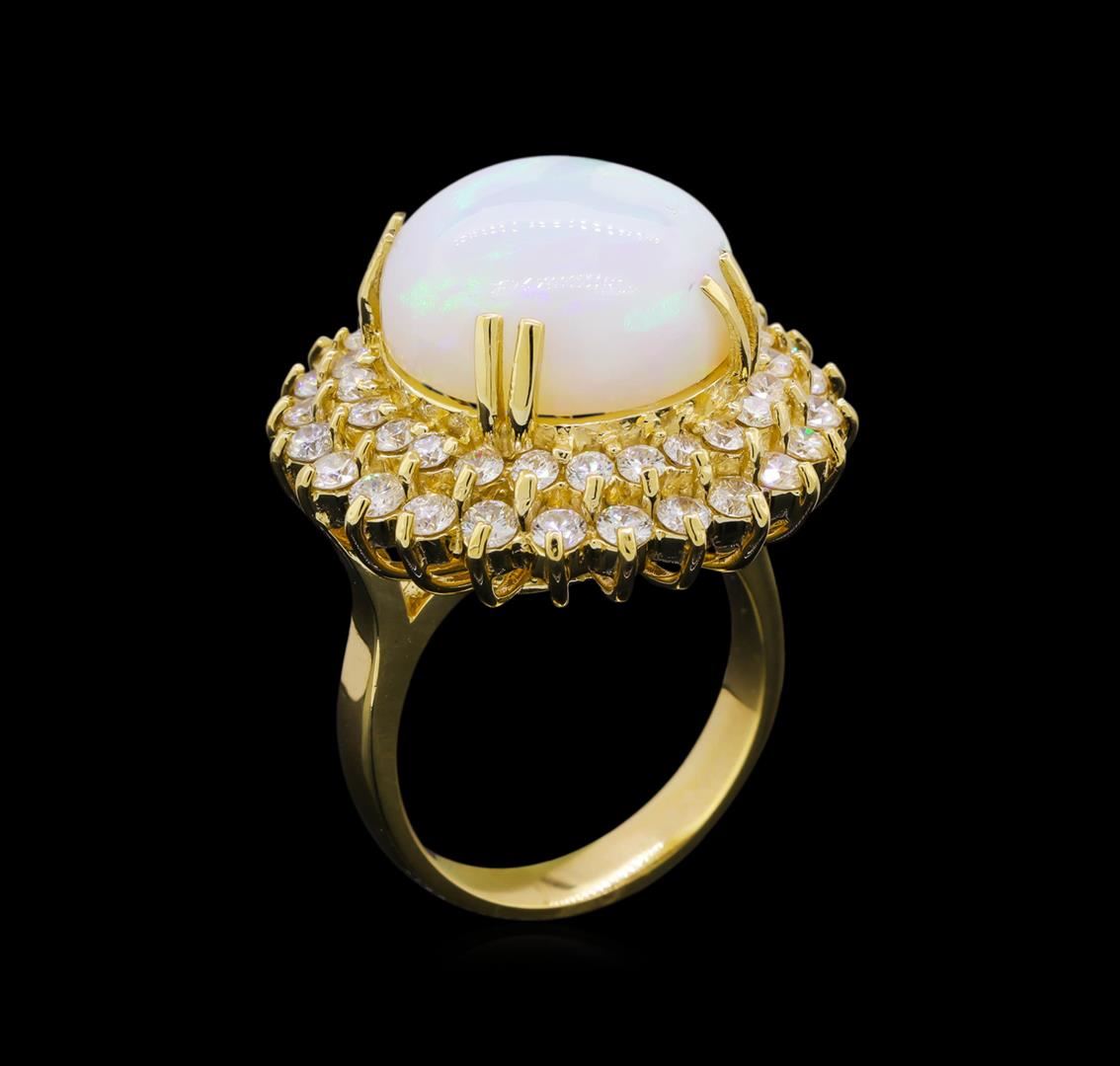 One electronically tested 14KT yellow gold lady's cast fashion ring with a double basket halo with a bright polish finish. The featured lady's ring has a shank measuring 3.68 millimeters in width. Identified with markings of "K14". Condition is new, good workmanship. Containing: One crystal opal that is cut in a round shaped cabochon and is prong set, measuring 15.20 mm long x 14.95 mm wide, and 7.58 mm thick and the approximate weight is 8.25 carats. The opal has a somewhat bright, blue-green play of color (fire) in a rolling flashfire pattern; a medium dome; a cut; no inclusions in its brightness and pattern; and is. Transmitting light somewhat diffusely, transparent to translucent. Graded in the setting. Twenty-Four prong set round brilliant cut diamonds, measuring 2.40 - 2.30 x 1.43mm (depth est.) approximate total weight of 24 Stones = 1.15ct. Graded in the setting. Clarity: SI-1 to SI-2. Color: H - I. Cut Good Twenty-Four prong set round brilliant cut diamonds, measuring 2.10 - 2.00 x 1.27mm (depth est.) approximate total weight of 24 Stones = 0.73ct. Graded in the setting. Clarity: SI-1 to SI-2. Color: H - I. Cut Good. Total Weight of Diamonds 1.88ct. Total Weight of Opals 8.25ct. Total Weight of Ring 12.90gm. GAS Appraised at $8,245.00.