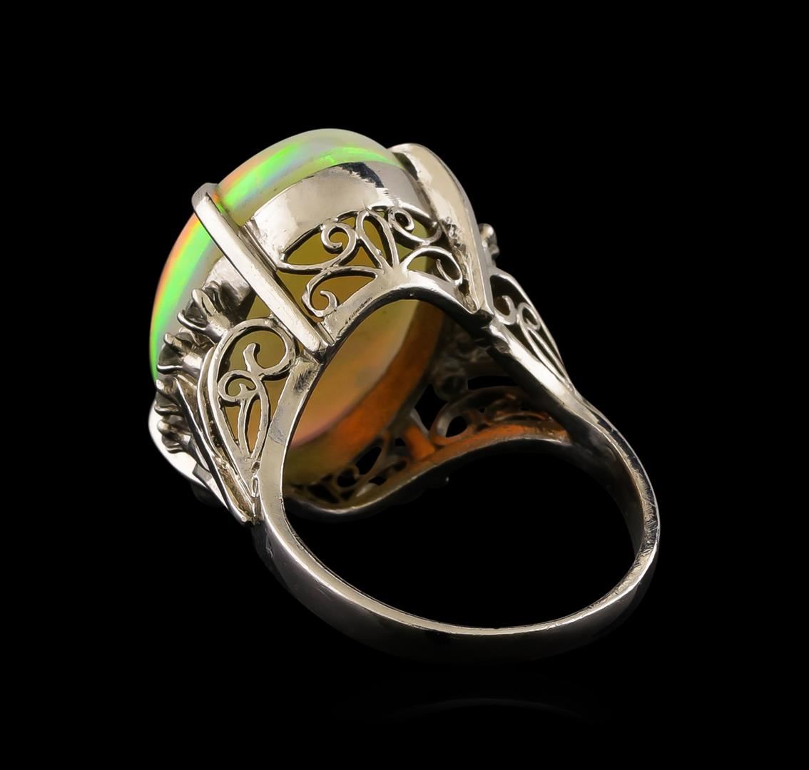 One electronically tested platinum ladies cast opal and diamond ring with a bright polish finish. The featured opal is set between mirroring diamond ribbon accents supported by a filigree lattice under gallery and tapering lattice shoulders, completed by a two millimeter wide band. Identified with markings of 'Pt900'. Condition is good. Containing: One semi crystal opal that is cut in a oval shaped cabochon and is prong set, measuring 18.30 mm long x 13.40 mm wide, and 5.40 mm thick and the approximate weight is 8.26 carats. The opal has a bright, multicolor play of color (fire) in a broad flashfire pattern; a medium dome; a good cut; no inclusions; slight variation in base in its brightness and pattern; and is slightly directional. Graded in the setting. Eight prong set round brilliant cut diamonds, measuring 1.90 - 1.70 x 1.08mm (depth est.) approximate total weight of 8 Stones = 0.20ct. Graded in the setting. Clarity SI-1 to I-1. Color: G - I. Total Weight of Diamonds 0.20ct.. Total Weight of Opals 8.26ct.. Total Weight of Ring 8.78gm. AIG Appraised at $4,595.00.