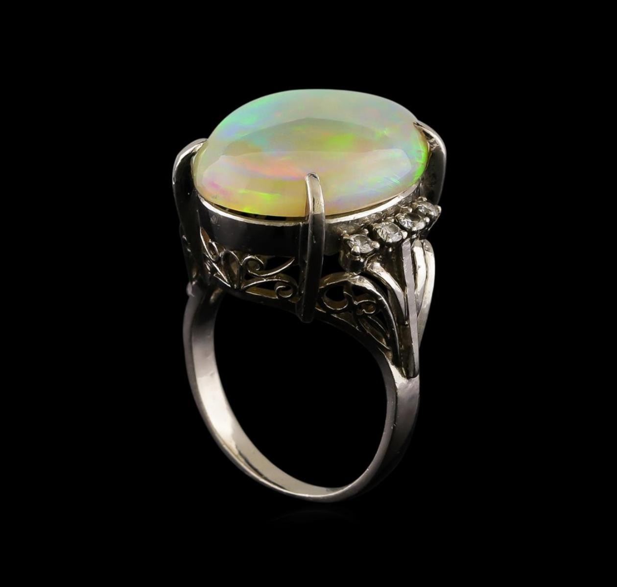 One electronically tested platinum ladies cast opal and diamond ring with a bright polish finish. The featured opal is set between mirroring diamond ribbon accents supported by a filigree lattice under gallery and tapering lattice shoulders, completed by a two millimeter wide band. Identified with markings of 'Pt900'. Condition is good. Containing: One semi crystal opal that is cut in a oval shaped cabochon and is prong set, measuring 18.30 mm long x 13.40 mm wide, and 5.40 mm thick and the approximate weight is 8.26 carats. The opal has a bright, multicolor play of color (fire) in a broad flashfire pattern; a medium dome; a good cut; no inclusions; slight variation in base in its brightness and pattern; and is slightly directional. Graded in the setting. Eight prong set round brilliant cut diamonds, measuring 1.90 - 1.70 x 1.08mm (depth est.) approximate total weight of 8 Stones = 0.20 ct. Graded in the setting. Clarity SI-1 to I-1. Color: G - I. Total Weight of Diamonds 0.20 ct.. Total Weight of Opals 8.26ct.. Total Weight of Ring 8.78gm. AIG Appraised.