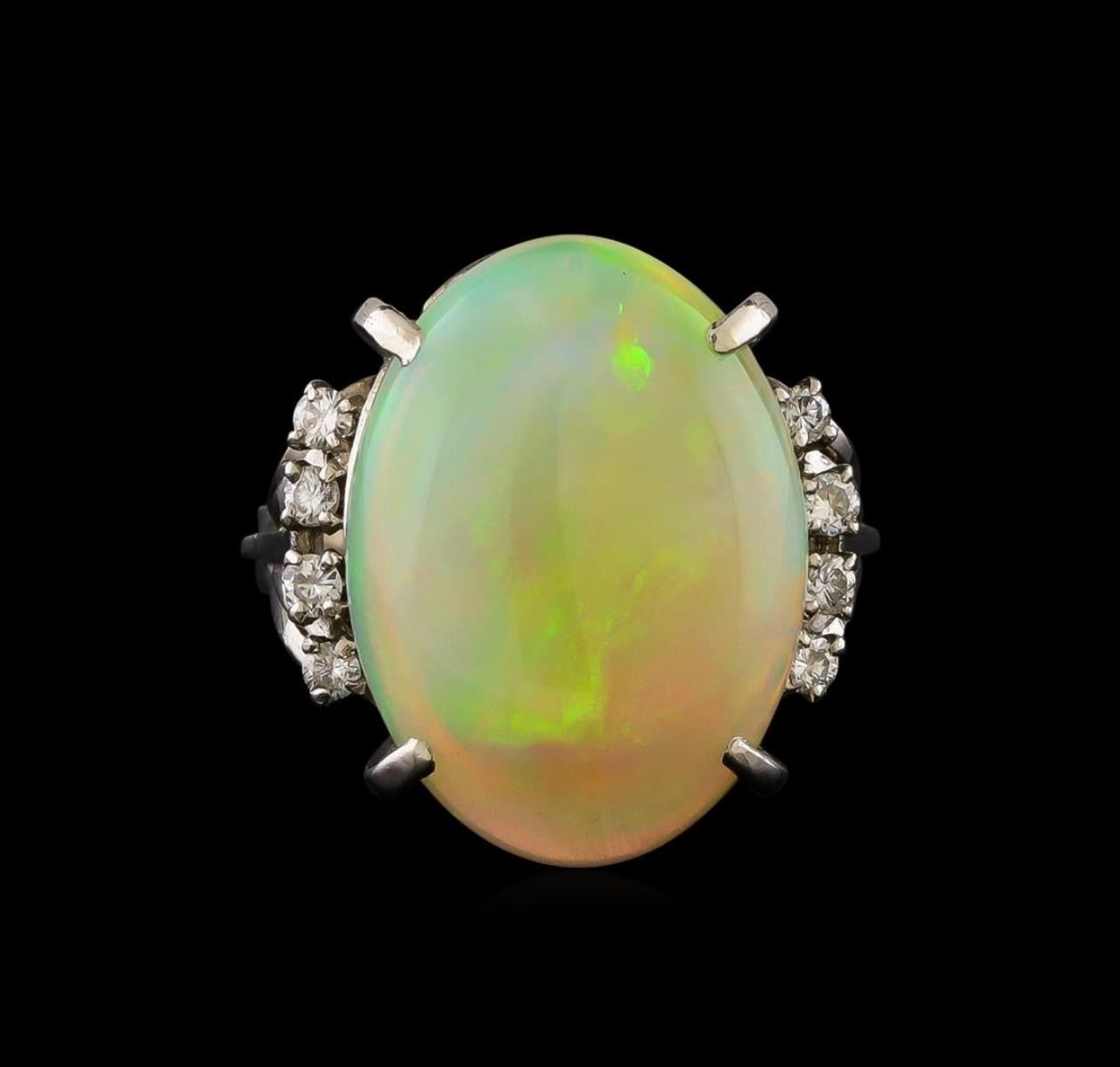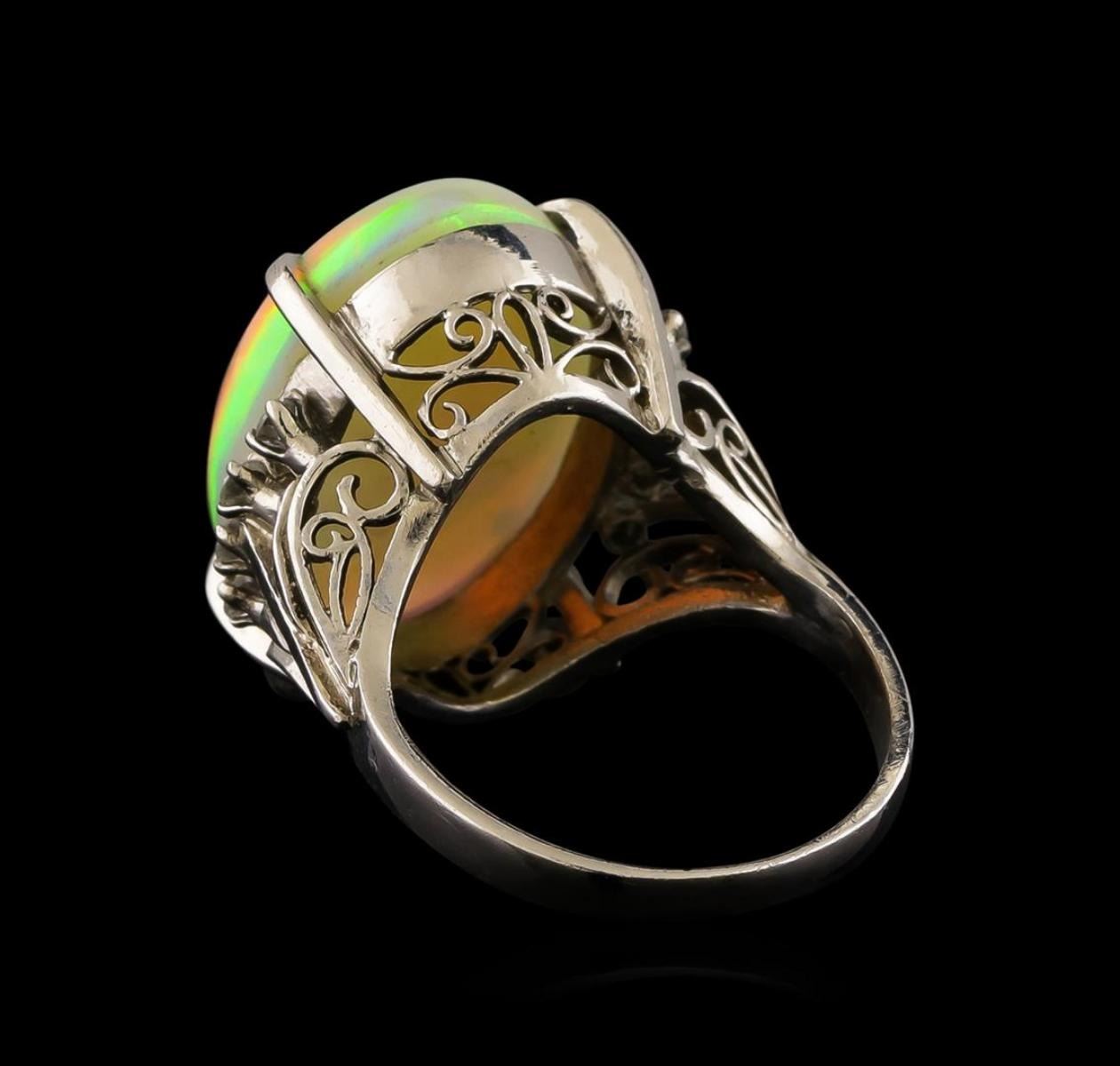 One electronically tested platinum ladies cast opal and diamond ring with a bright polish finish. The featured opal is set between mirroring diamond ribbon accents supported by a filigree lattice under gallery and tapering lattice shoulders, completed by a two millimeter wide band. Identified with markings of 'Pt900'. Condition is good. Containing: One semi crystal opal that is cut in a oval shaped cabochon and is prong set, measuring 18.30 mm long x 13.40 mm wide, and 5.40 mm thick and the approximate weight is 8.26 carats. The opal has a bright, multicolor play of color (fire) in a broad flashfire pattern; a medium dome; a good cut; no inclusions; slight variation in base in its brightness and pattern; and is slightly directional. Graded in the setting. Eight prong set round brilliant cut diamonds, measuring 1.90 - 1.70 x 1.08mm (depth est.) approximate total weight of 8 Stones = 0.20 ct. Graded in the setting. Clarity SI-1 to I-1. Color: G - I. Total Weight of Diamonds 0.20 ct.. Total Weight of Opals 8.26ct.. Total Weight of Ring 8.78gm. AIG Appraised.