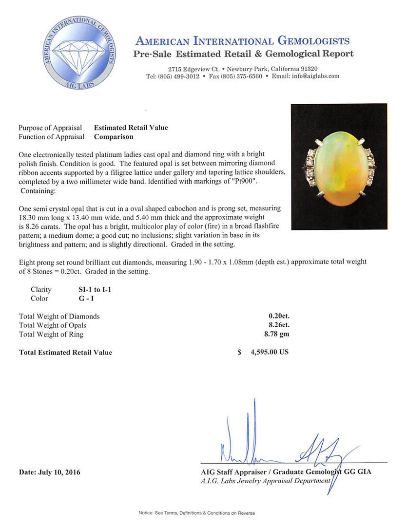 One electronically tested platinum ladies cast opal and diamond ring with a bright polish finish. The featured opal is set between mirroring diamond ribbon accents supported by a filigree lattice under gallery and tapering lattice shoulders, completed by a two millimeter wide band. Identified with markings of 'Pt900'. Condition is good. Containing: One semi crystal opal that is cut in a oval shaped cabochon and is prong set, measuring 18.30 mm long x 13.40 mm wide, and 5.40 mm thick and the approximate weight is 8.26 carats. The opal has a bright, multicolor play of color (fire) in a broad flashfire pattern; a medium dome; a good cut; no inclusions; slight variation in base in its brightness and pattern; and is slightly directional. Graded in the setting. Eight prong set round brilliant cut diamonds, measuring 1.90 - 1.70 x 1.08mm (depth est.) approximate total weight of 8 Stones = 0.20 ct. Graded in the setting. Clarity SI-1 to I-1. Color: G - I. Total Weight of Diamonds 0.20 ct.. Total Weight of Opals 8.26ct.. Total Weight of Ring 8.78gm. AIG Appraised.