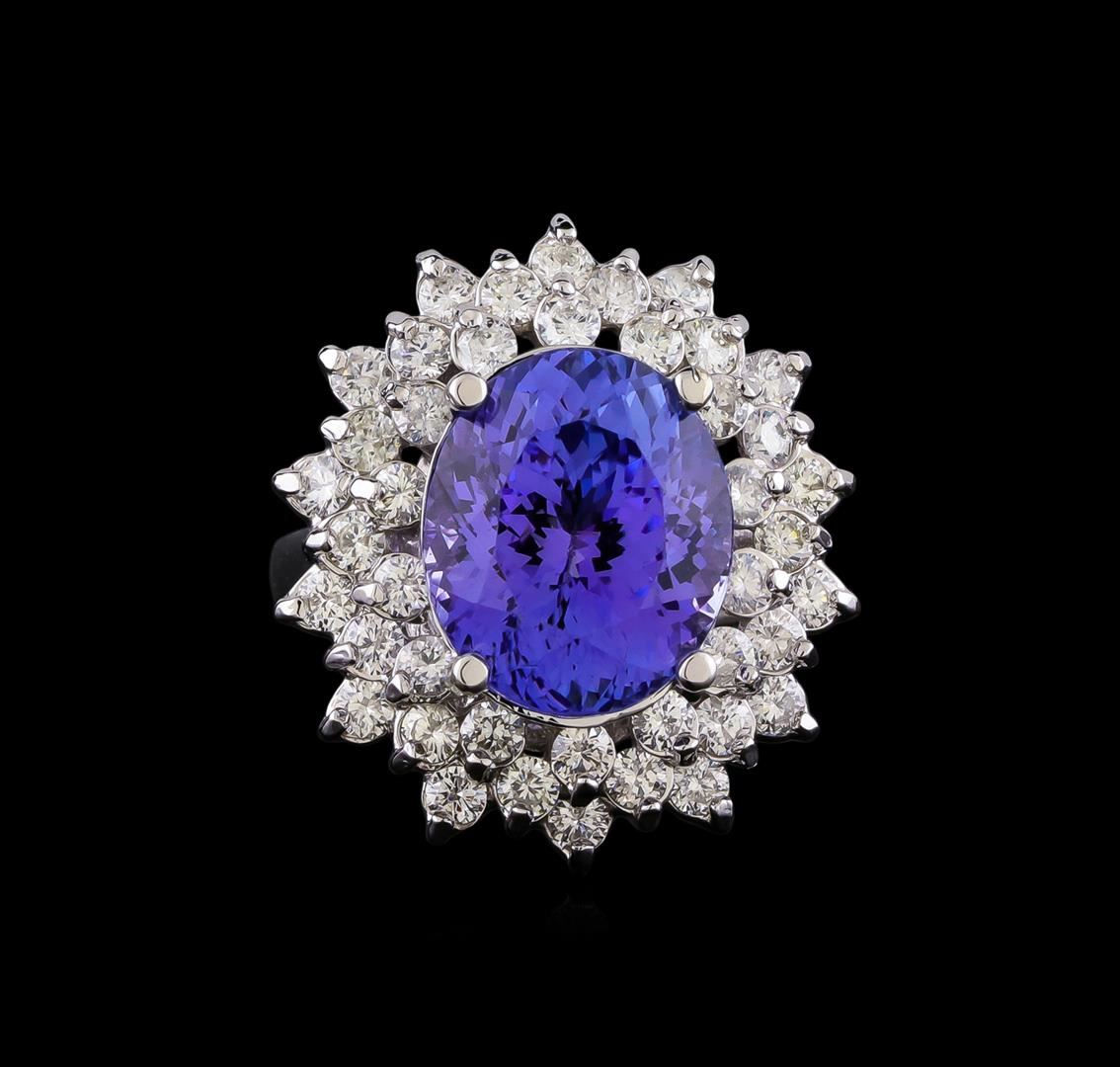 One electronically tested 14KT white gold lady's cast fashion ring with a double basket halo with a bright polish finish. The featured lady's has a shank measuring 2.65 millimeters in width. Identified with markings of "K14". Condition is new, good workmanship. Containing: One prong set oval modified brilliant cut natural tanzanite, measuring 13.25 x 11.13 x 8.23mm, (depth est.) approximate weight of 8.26ct., clarity is eye clean, medium, moderately strong, violetish blue color, (GIA vB 5/4), cut is very good. Transmitting light with no distortion, transparent. Colored gemstones are presumed to have been subjected to commonly used enhancement processes. Graded in the setting. Forty-Two prong set round brilliant cut diamonds, measuring 2.25 - 2.20 x 1.38mm (depth est.) approximate total weight of 42 Stones = 1.75ct. Graded in the setting. Clarity: SI-1 to SI-2. Color: G - I. Cut Good. Total Weight of Colored Stones 8.26ct. Total Weight of Diamonds 1.75ct. Total Weight of Ring 9.50gm. GAS Appraised.