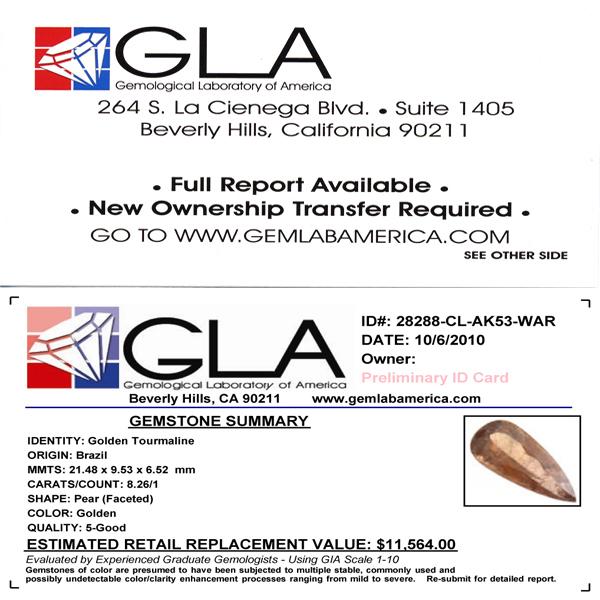 Excellent golden colored specimen pear cut; lab quality evaluation 5; treatment as noted; Gem Guide wholesale $1652-$2891; full retail appraisal $11564; full lab evaluation available
