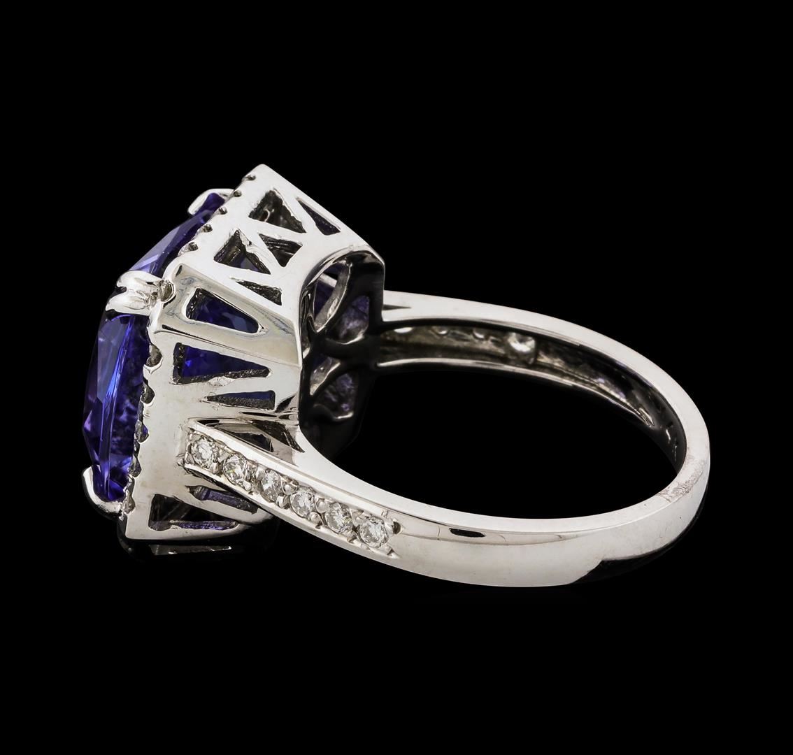One electronically tested 14KT white gold lady's cast fashion ring with a cathedral cushion halo with a bright polish finish. The featured lady's ring has a shank measuring 2.67 millimeters wide. Identified with markings of '14K'. Condition is new, good workmanship. Containing: One prong set square cushion modified brilliant cut natural tanzanite, measuring 12.12 x 12.02 x 7.36mm, (depth est.) approximate weight of 8.27ct., clarity is eye clean, medium, moderately strong, violet color, (GIA V 5/4), cut is very good. Transmitting light with no distortion, transparent. Colored gemstones are presumed to have been subjected to commonly used enhancement processes. Graded in the setting. Twenty-Four prong set round brilliant cut diamonds, measuring 1.60 - 1.55 x 0.98mm (depth est.) approximate total weight of 24 Stones = 0.35ct. Graded in the setting. Clarity SI-1 to SI-2. Color: G - H Cut Good Twelve prong set round brilliant cut diamonds, measuring 1.50 - 1.45 x 0.92mm (depth est.) approximate total weight of 12 Stones = 0.15ct. Graded in the setting. Clarity SI-1 to SI-2. Color: G - H Cut Good. Total Weight of Colored Stones 8.27ct.. Total Weight of Diamonds 0.50ct.. Total Weight of Ring 6.80gm. GAS Appraised at $11,925.00.