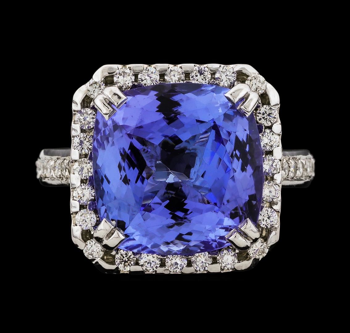 One electronically tested 14KT white gold lady's cast fashion ring with a cathedral cushion halo with a bright polish finish. The featured lady's ring has a shank measuring 2.67 millimeters wide. Identified with markings of '14K'. Condition is new, good workmanship. Containing: One prong set square cushion modified brilliant cut natural tanzanite, measuring 12.12 x 12.02 x 7.36mm, (depth est.) approximate weight of 8.27ct., clarity is eye clean, medium, moderately strong, violet color, (GIA V 5/4), cut is very good. Transmitting light with no distortion, transparent. Colored gemstones are presumed to have been subjected to commonly used enhancement processes. Graded in the setting. Twenty-Four prong set round brilliant cut diamonds, measuring 1.60 - 1.55 x 0.98mm (depth est.) approximate total weight of 24 Stones = 0.35ct. Graded in the setting. Clarity SI-1 to SI-2. Color: G - H Cut Good Twelve prong set round brilliant cut diamonds, measuring 1.50 - 1.45 x 0.92mm (depth est.) approximate total weight of 12 Stones = 0.15ct. Graded in the setting. Clarity SI-1 to SI-2. Color: G - H Cut Good. Total Weight of Colored Stones 8.27ct.. Total Weight of Diamonds 0.50ct.. Total Weight of Ring 6.80gm. GAS Appraised at $11,925.00.