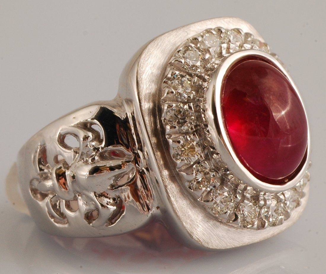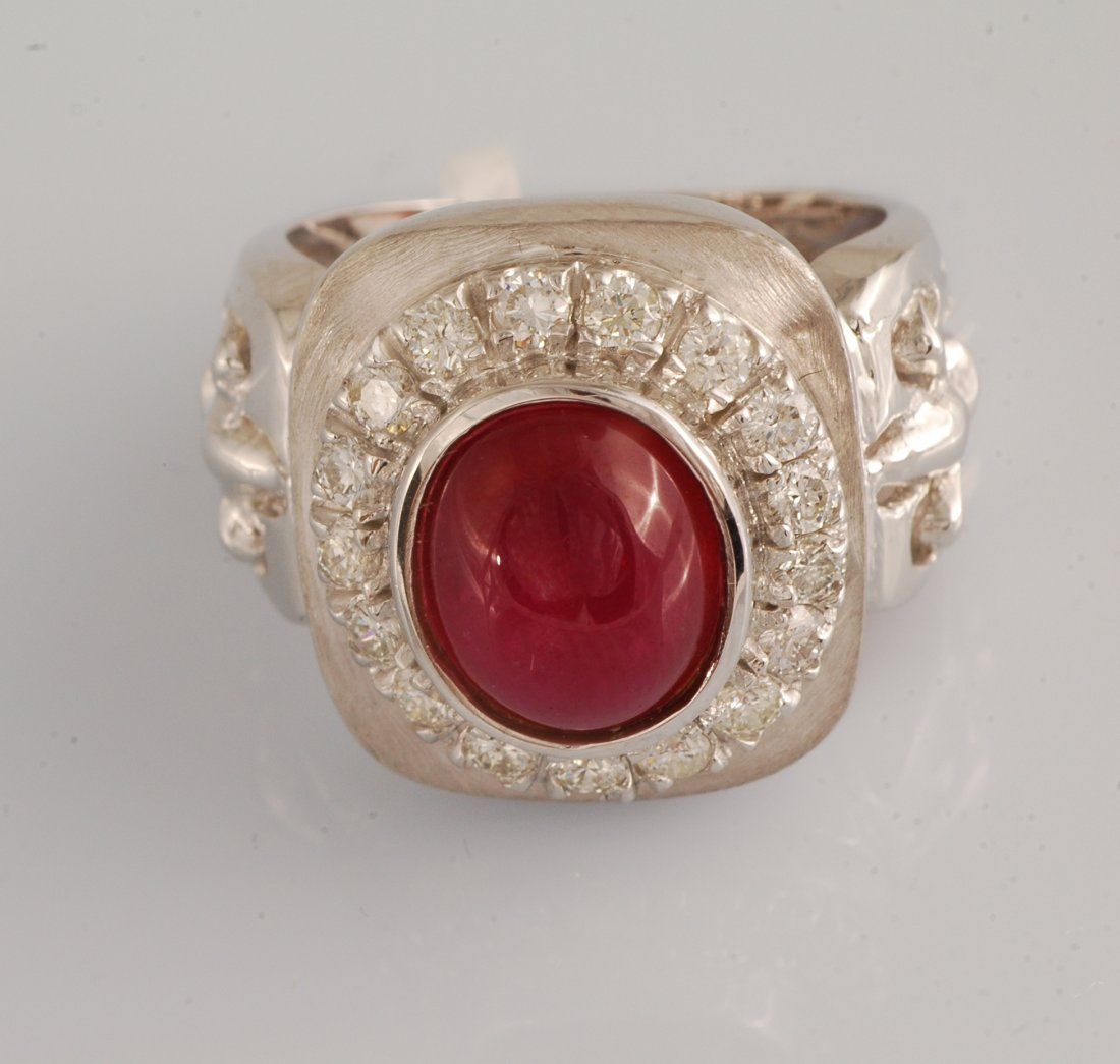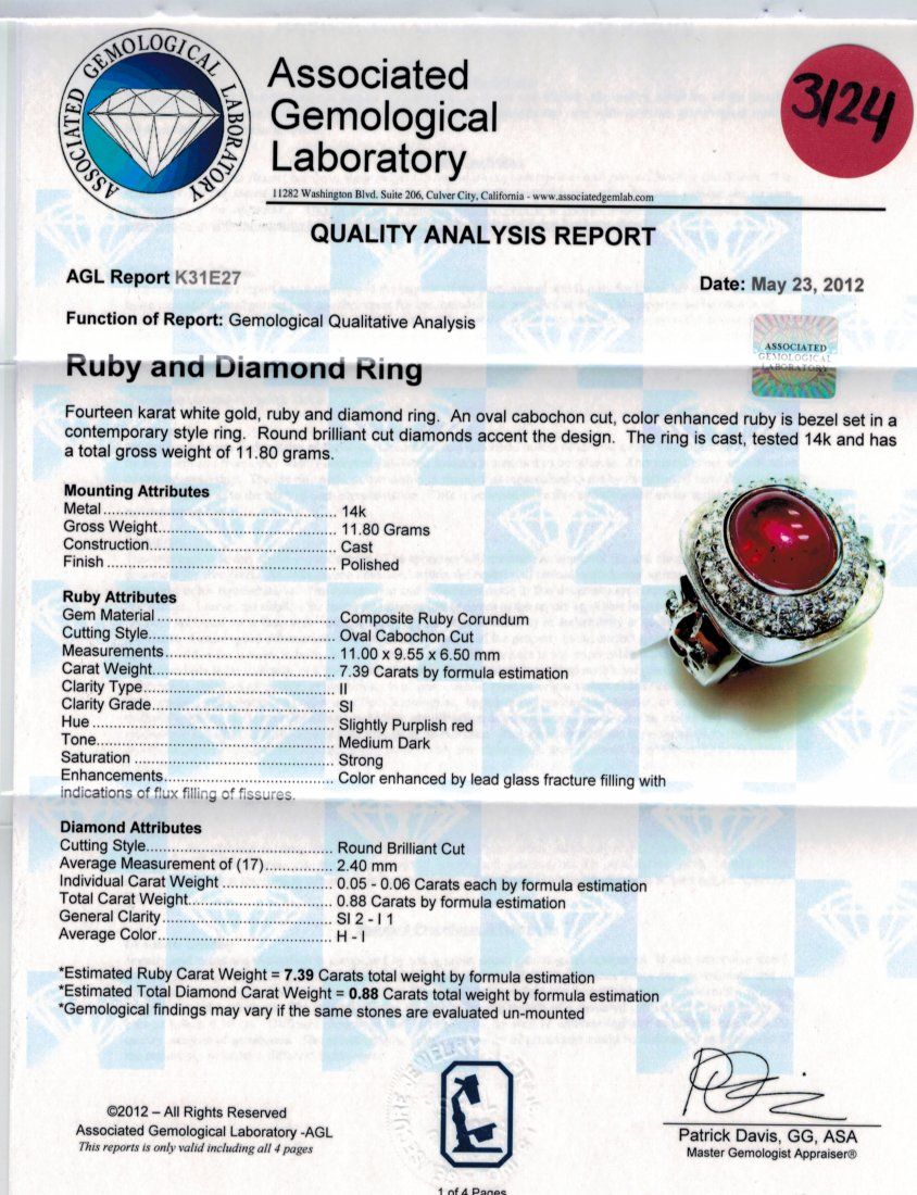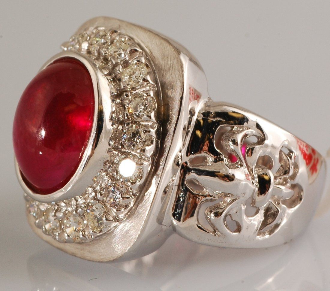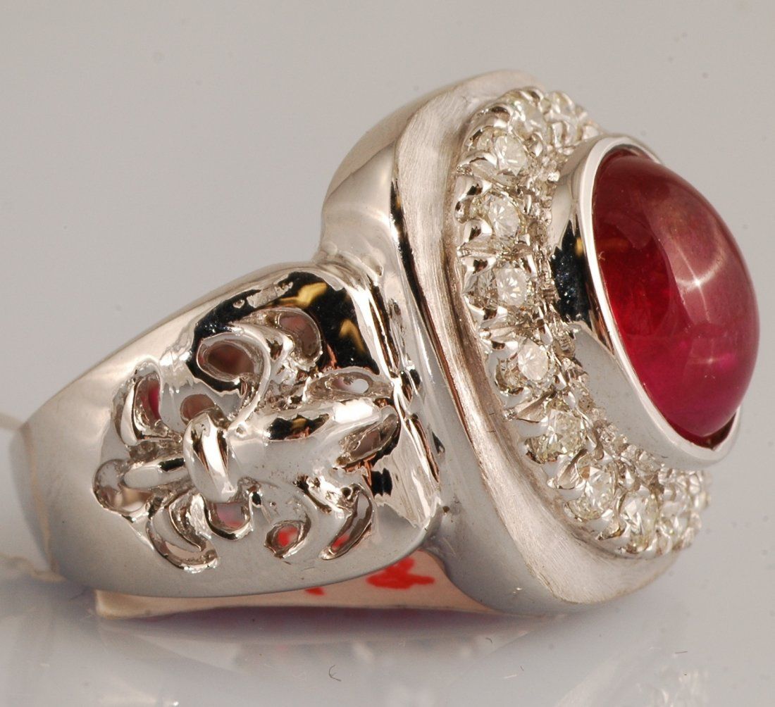 11.8 GR 14K White gold, 0.88ct Diamonds & 7.39ct Cabochon Ruby. An oval cabochon cut, ruby is bezel set in a contemporary style ring. Round brilliant cut diamonds accent the design. The ring is cast, tested 14K and has a total weight of 11.80 grams.