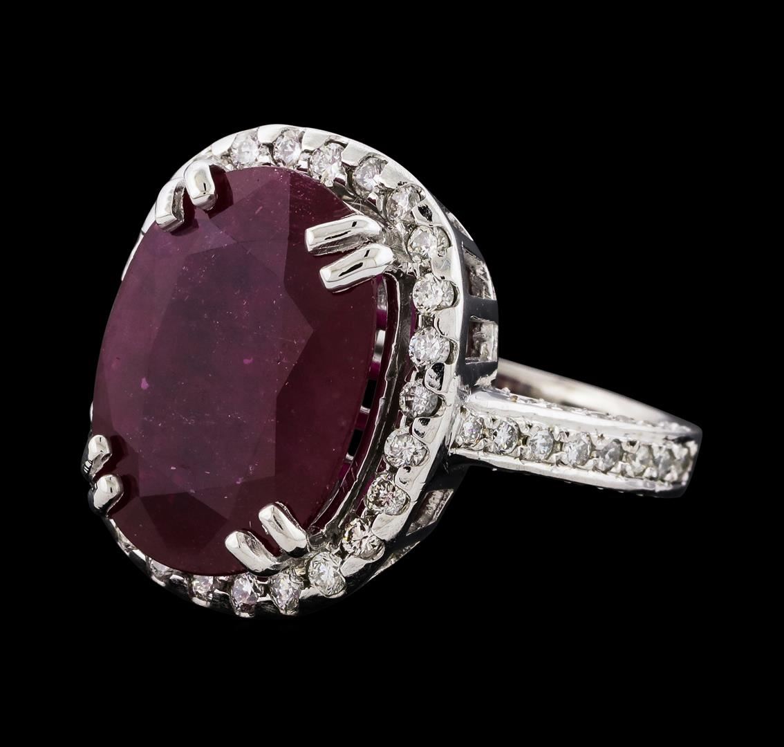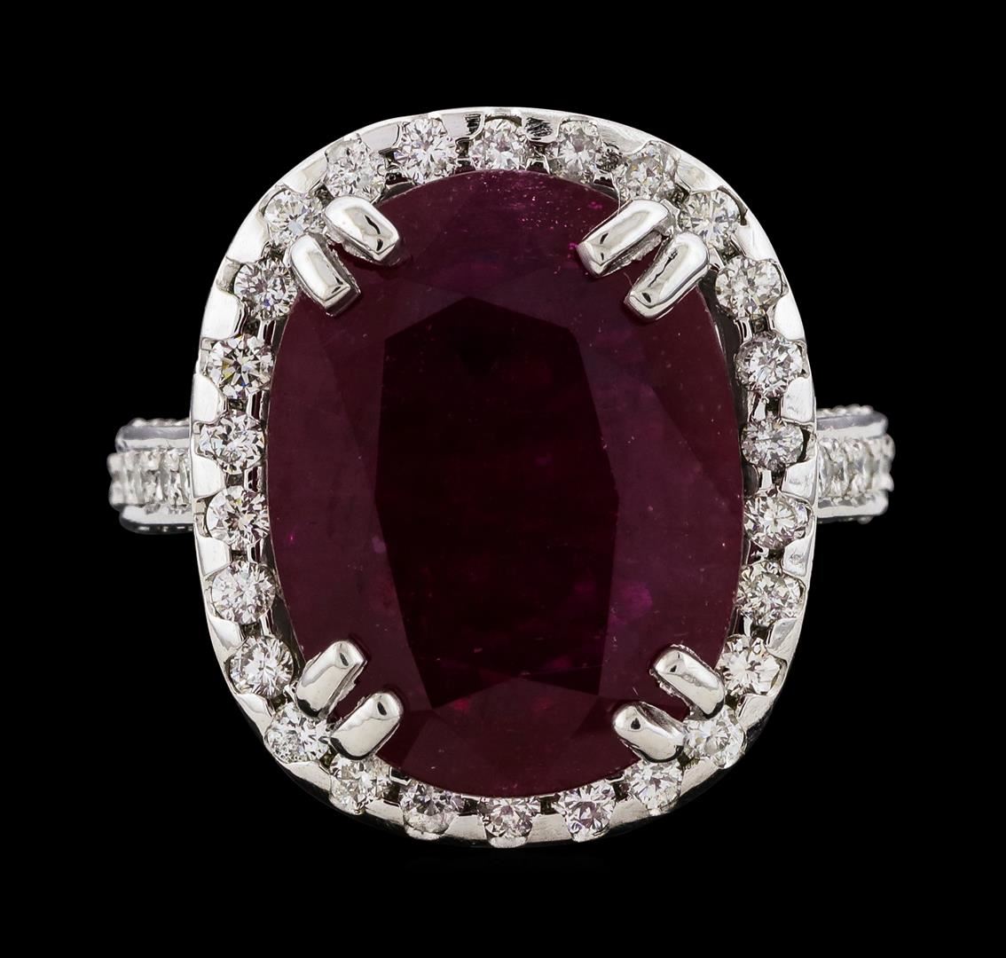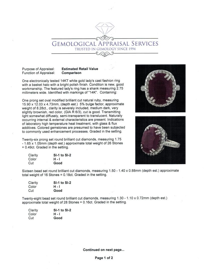 One electronically tested 14KT white gold lady's cast fashion ring with a basket halo with a bright polish finish. The featured lady's ring has a shank measuring 2.75 millimeters wide. Identified with markings of '14K'. Condition is new, good workmanship. Containing: One prong set oval modified brilliant cut natural ruby, measuring 15.90 x 12.03 x 4.73mm, (depth est.) 5%. bulge factor, approximate weight of 8.28ct., clarity is severely included, medium dark, very slightly brownish, red color, (GIA R 6/3), cut is good. Transmitting light somewhat diffusely, semi-transparent to translucent. Naturally occurring internal & external characteristics are present. Indications of laboratory high temperature heat treatment, with glass & flux additives. Colored gemstones are presumed to have been subjected to commonly used enhancement processes. Graded in the setting. Twenty-Six prong set round brilliant cut diamonds, measuring 1.75 - 1.65 x 1.05mm (depth est.) approximate total weight of 26 Stones = 0.49ct. Graded in the setting. Clarity SI-1 to SI-2. Color: H - I Cut Good Sixteen bead set round brilliant cut diamonds, measuring 1.50 - 1.40 x 0.88mm (depth est.) approximate total weight of 16 Stones = 0.18ct. Graded in the setting. Clarity SI-1 to SI-2. Color: H - I Cut Good Twenty-Eight bead set round brilliant cut diamonds, measuring 1.30 - 1.10 x 0.72mm (depth est.) approximate total weight of 28 Stones = 0.16ct. Graded in the setting. Clarity SI-1 to SI-2. Color: H - I Cut Good. Total Weight of Colored Stones 8.28ct.. Total Weight of Diamonds 0.83ct.. Total Weight of Ring 9.00gm. GAS Appraised at $7,090.00.