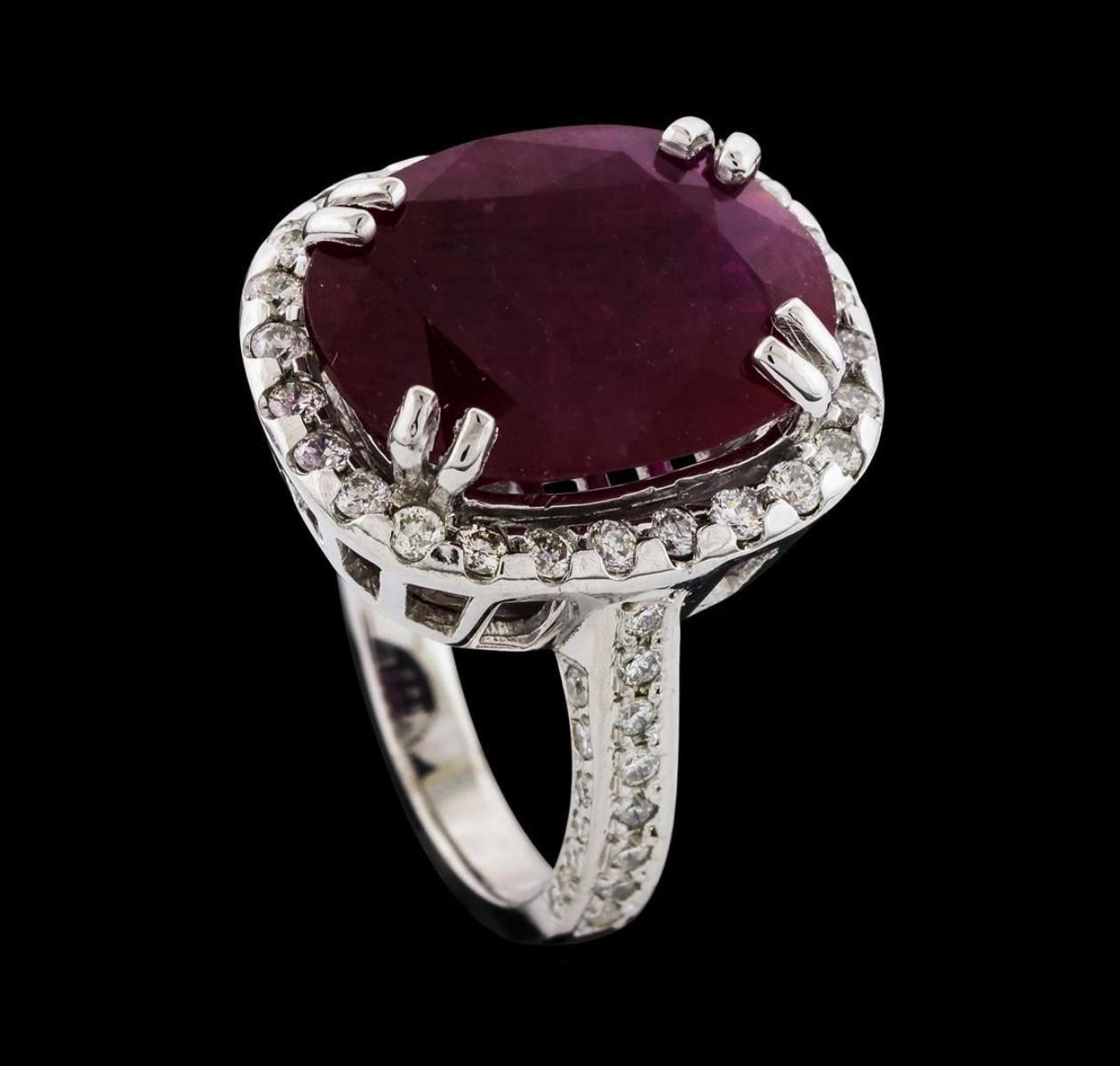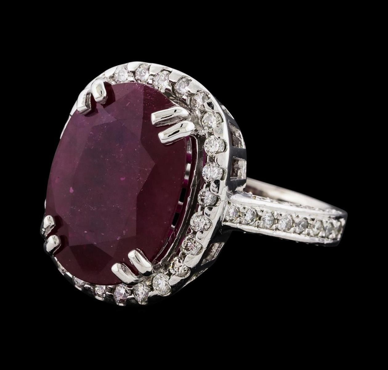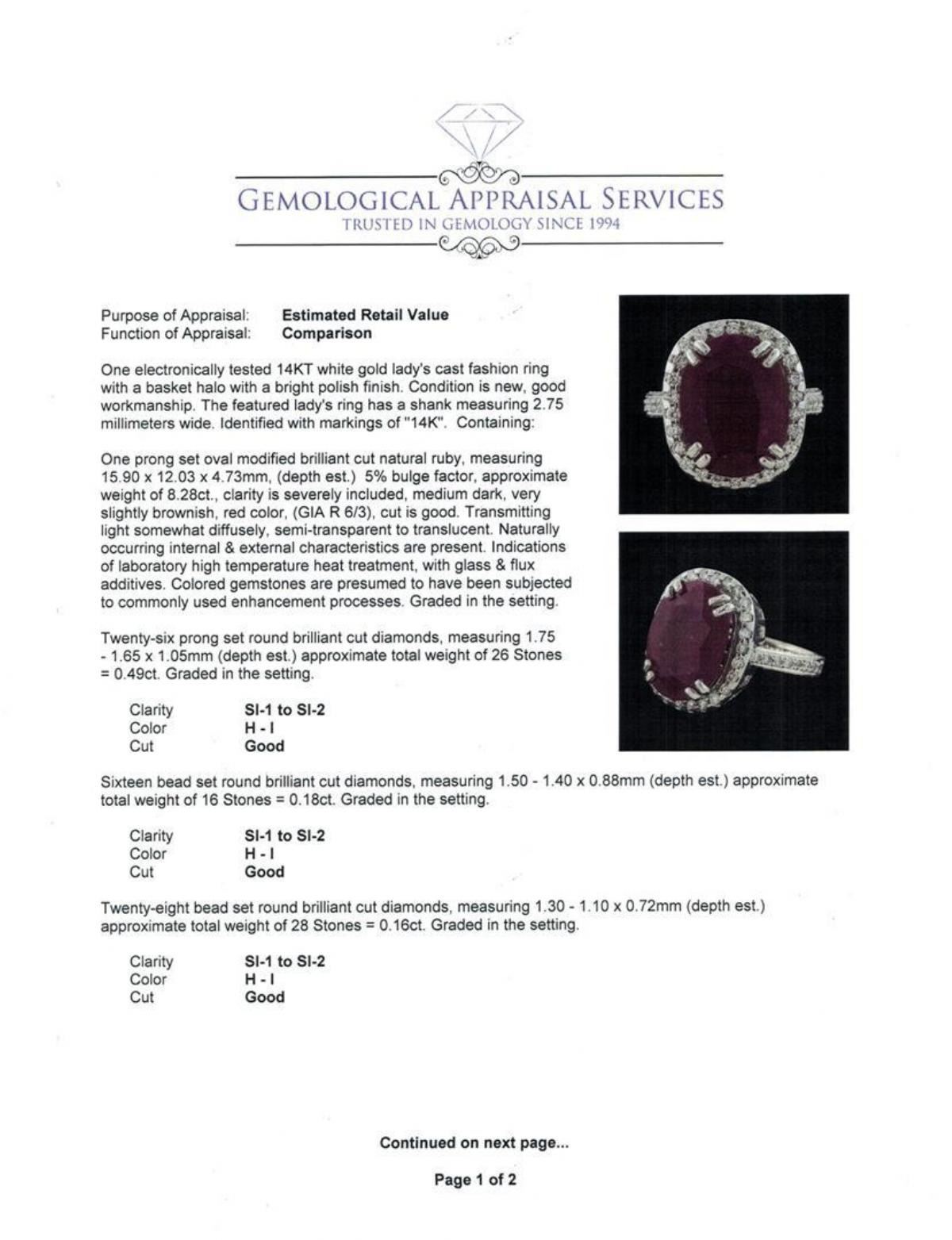 One electronically tested 14KT white gold lady's cast fashion ring with a basket halo with a bright polish finish. The featured lady's ring has a shank measuring 2.75 millimeters wide. Identified with markings of '14K'. Condition is new, good workmanship. Containing: One prong set oval modified brilliant cut natural ruby, measuring 15.90 x 12.03 x 4.73mm, (depth est.) 5%. bulge factor, approximate weight of 8.28ct., clarity is severely included, medium dark, very slightly brownish, red color, (GIA R 6/3), cut is good. Transmitting light somewhat diffusely, semi-transparent to translucent. Naturally occurring internal & external characteristics are present. Indications of laboratory high temperature heat treatment, with glass & flux additives. Colored gemstones are presumed to have been subjected to commonly used enhancement processes. Graded in the setting. Twenty-Six prong set round brilliant cut diamonds, measuring 1.75 - 1.65 x 1.05mm (depth est.) approximate total weight of 26 Stones = 0.49ct. Graded in the setting. Clarity SI-1 to SI-2. Color: H - I Cut Good Sixteen bead set round brilliant cut diamonds, measuring 1.50 - 1.40 x 0.88mm (depth est.) approximate total weight of 16 Stones = 0.18ct. Graded in the setting. Clarity SI-1 to SI-2. Color: H - I Cut Good Twenty-Eight bead set round brilliant cut diamonds, measuring 1.30 - 1.10 x 0.72mm (depth est.) approximate total weight of 28 Stones = 0.16ct. Graded in the setting. Clarity SI-1 to SI-2. Color: H - I Cut Good. Total Weight of Colored Stones 8.28ct.. Total Weight of Diamonds 0.83ct.. Total Weight of Ring 9.00gm. GAS Appraised.