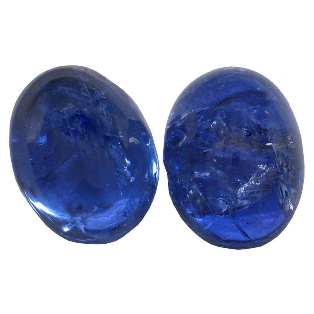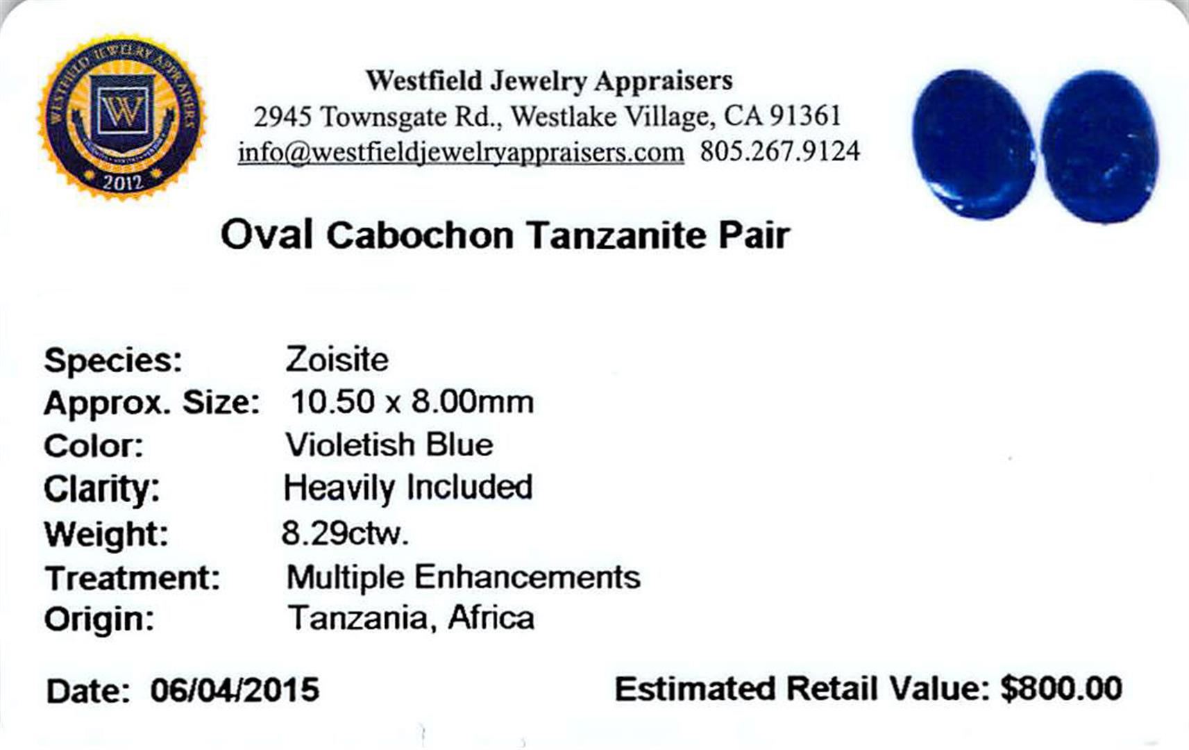 Two oval cabochon cut natural tanzanites, measuring 10.50 x 8.00 x 5.20mm, exact total weight 8.29ct., clarity is heavily included, type I, dark, moderately strong, violetish blue color, (GIA vB 7/4), cut is good. Transmitting light somewhat diffusely, transparent to translucent. Naturally occurring internal & external characteristics are present. Measurements & the color grade are an average for the pair. Tanzanite is a very rare gemstone that is only found in the country of Tanzania. Originally discovered in 1967. Tiffany & Company, named the stone Tanzanite. It is found in the Usumburu Mountains that border the Umba Valley of northern Tanzania. Tanzanite occurs in gray, brown, violet, blue, reddish-purple, & green. The gem is interesting because of its exceptional pleochroism. Rotated in different directions a tanzanite will exhibit multiple changes of color. Tanzanite has a low tolerance to ultrasonic cleaning, and should not be cleaned using this method. Westfield Appraised at $800.00.