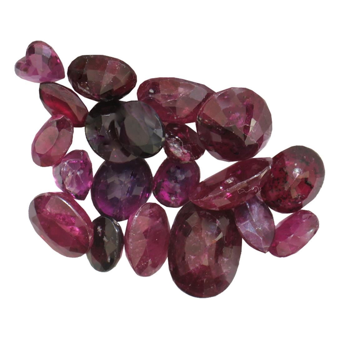 Twenty various shapes & sizes cut natural rubies exact total weight 8.29ct., clarity is heavily included, type II, dark, very slightly brownish, slightly purplish red color, (GIA slpR 7/3), cut is good. Transmitting light somewhat diffusely, transparent to translucent. Naturally occurring internal & external characteristics are present. Indications of laboratory high temperature heat treatment, with glass & flux additives. Ruby has a low tolerance to rhodium plating, repolishing the surface, & ultrasonic cleaning. Westfield Appraised at $825.00.