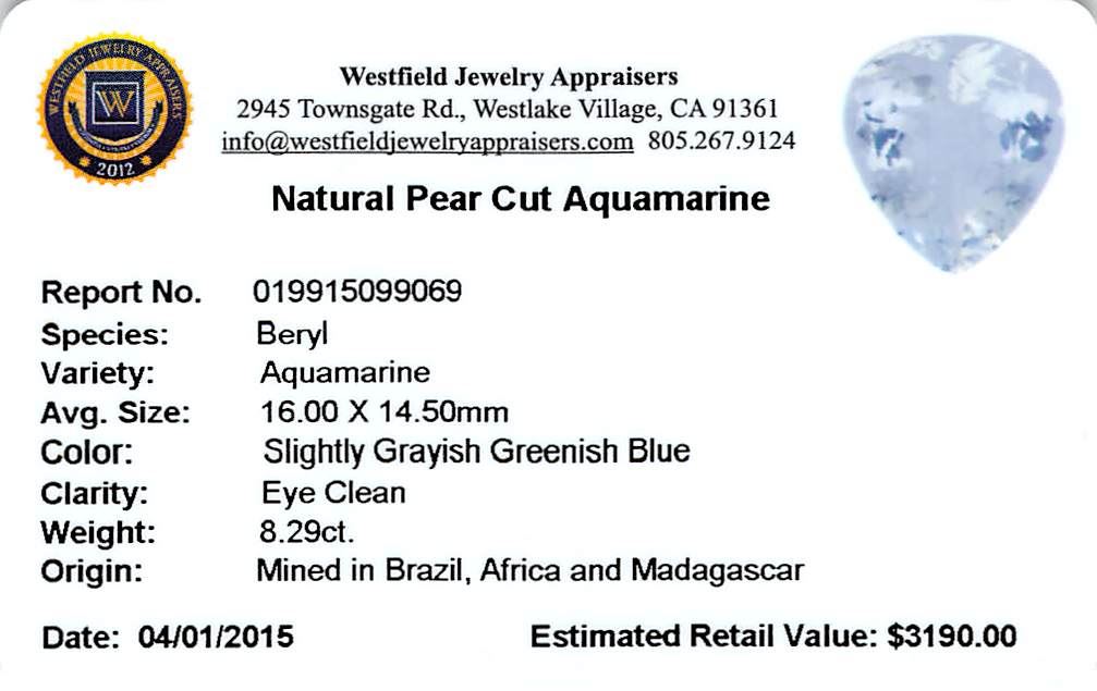 One pear cut natural aquamarine exact weight 8.29ct., clarity is eye clean, type I, medium, very slightly grayish, very slightly greenish blue color, (GIA vslgB 5/3), cut is good. Westfield Appraised at $3,190.00.