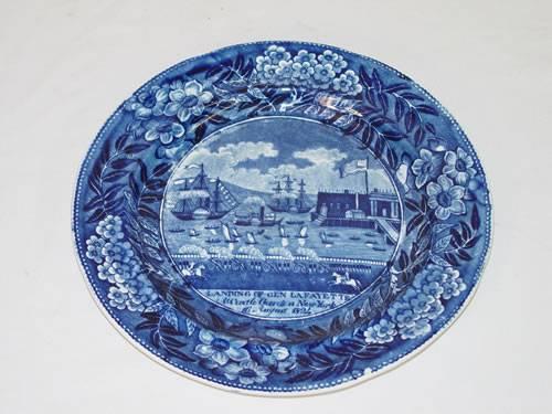 8 3/4" DARK BLUE HISTORICAL STAFFORDSHIRE PLATE- LANDING OF GENERAL LAFAYETTE AT CASTLE GARDEN BY CLEWS - MINOR SURFACE WEAR;