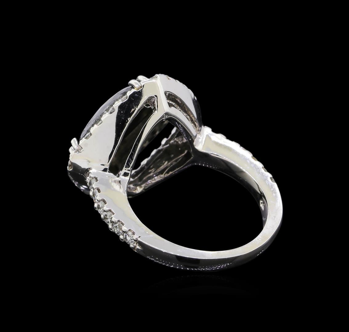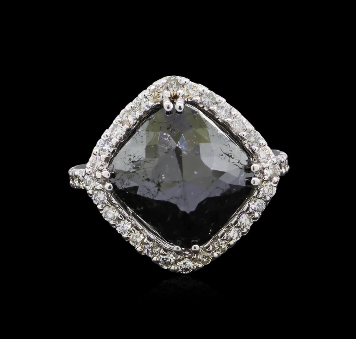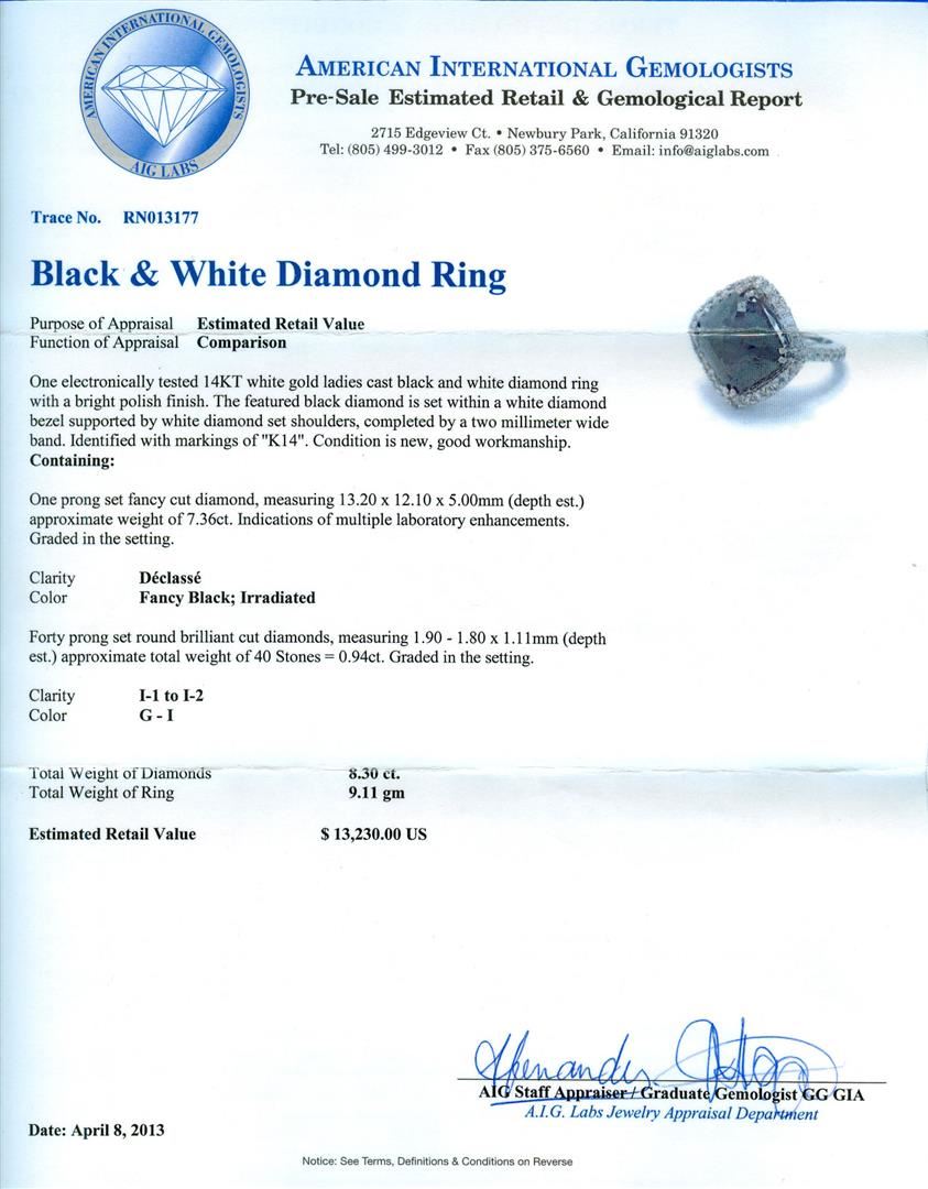 One electronically tested 14KT white gold ladies cast black and white diamond ring with a bright polish finish. The featured black diamond is set within a white diamond bezel supported by white diamond set shoulders, completed by a two millimeter wide band. Identified with markings of "K14". Condition is new, good workmanship. Containing: One prong set fancy cut diamond, measuring 13.20 x 12.10 x 5.00mm (depth est.) approximate weight of 7.36ct. Indications of multiple laboratory enhancements. Graded in the setting. Clarity Déclassé,. Color: Fancy Black; Irradiated. Forty prong set round brilliant cut diamonds, measuring 1.90 - 1.80 x 1.11mm (depth est.) approximate total weight of 40 Stones = 0.94ct. Graded in the setting. Clarity: I-1 to I-2. Color: G - I. Total Weight of Diamonds 8.30ct. Total Weight of Ring 9.11gm. AIG Appraised at $13,230.00.