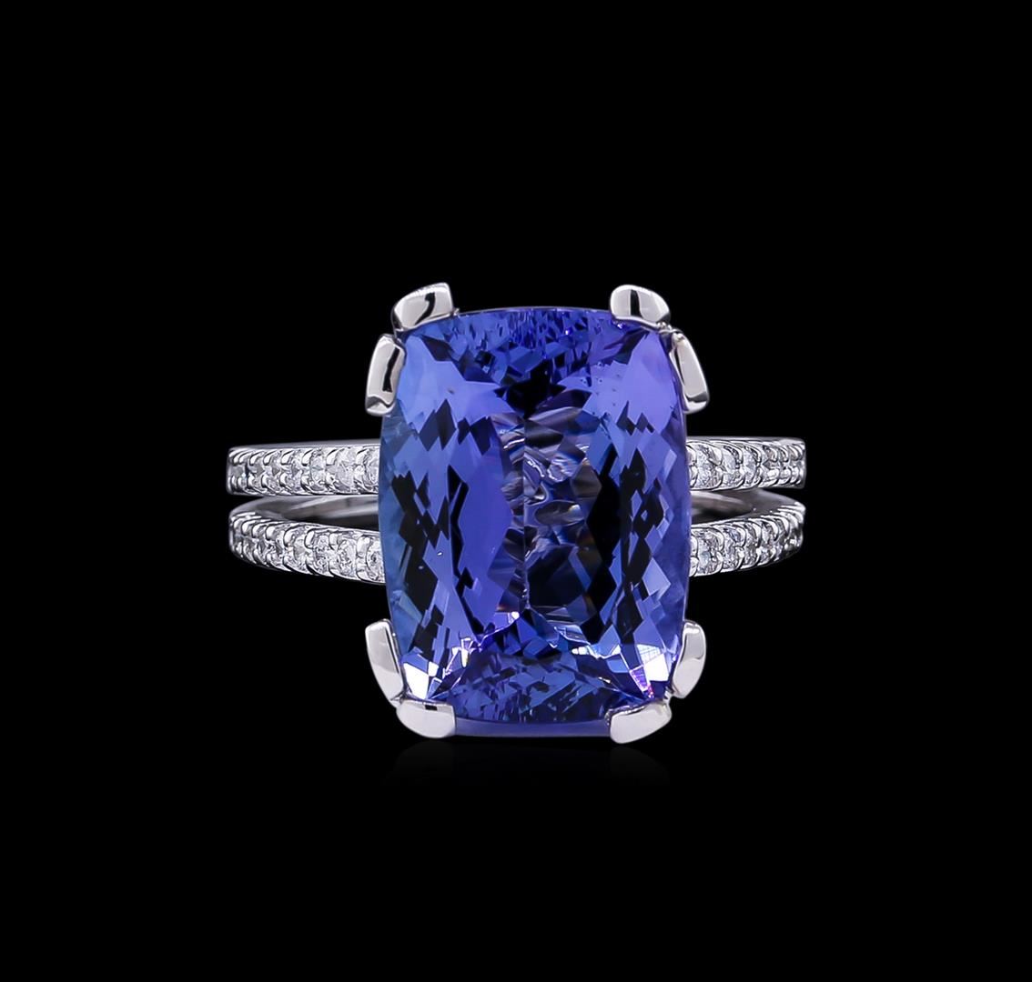 One electronically tested 14KT white gold lady's cast fashion ring with a split shank with a bright polish finish. The featured lady's ring has a shank measuring 2.93 millimeters wide. Identified with markings of "14K". Condition is new, good workmanship. Containing: One prong set rectangular cushion modified brilliant cut natural tanzanite, measuring 14.28 x 10.66 x 6.93mm, approximate weight of 8.30ct., clarity is eye clean, type I, medium light, very slightly grayish, bluish violet color, (GIA bV 4/3), cut is good. Transmitting light with no distortion, transparent. Colored gemstones are presumed to have been subjected to commonly used enhancement processes. Graded in the setting. Thirty-Six prong set round brilliant cut diamonds, measuring 1.30 - 1.25 x 0.81mm (depth est.) approximate total weight of 36 Stones = 0.30ct. Graded in the setting. Clarity: SI-1 to I-1. Color: G - Good. Total Weight of Colored Stones 8.30ct. Total Weight of Diamonds 0.30ct. Total Weight of Ring 7.10gm. GAS Appraised at $9,770.00.
