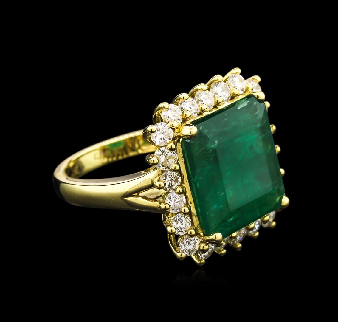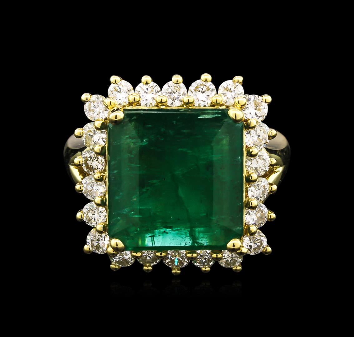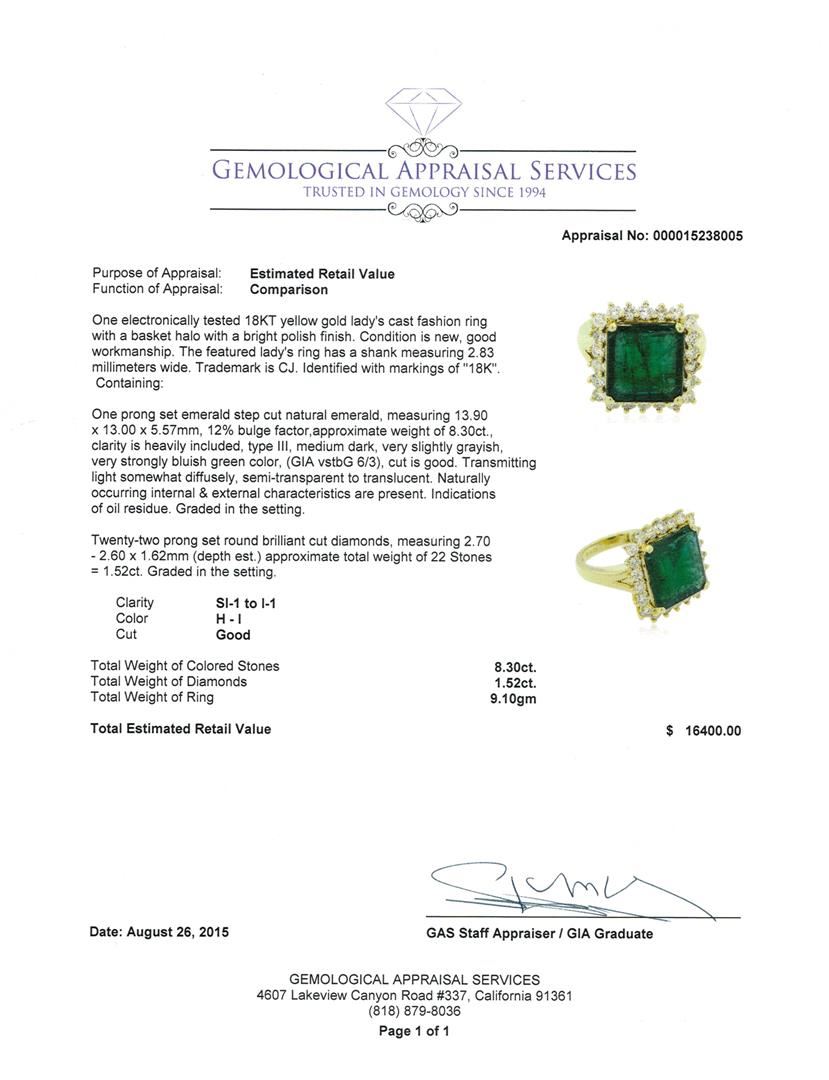 One electronically tested 18KT yellow gold lady's cast fashion ring with a basket halo with a bright polish finish. The featured lady's ring has a shank measuring 2.83 millimeters wide. Trademark is CJ. Identified with markings of "18K". Condition is new, good workmanship. Containing: One prong set emerald step cut natural emerald, measuring 13.90 x 13.00 x 5.57mm, 12% bulge factor, approximate weight of 8.30ct., clarity is heavily included, type III, medium dark, very slightly grayish, very strongly bluish green color, (GIA vstbG 6/3), cut is good. Transmitting light somewhat diffusely, semi-transparent to translucent. Naturally occurring internal & external characteristics are present. Indications of oil residue. Graded in the setting. Twenty-Two prong set round brilliant cut diamonds, measuring 2.70 - 2.60 x 1.62mm (depth est.) approximate total weight of 22 Stones = 1.52ct. Graded in the setting. Clarity: SI-1 to I-1. Color: H - I. Cut Good. Total Weight of Colored Stones 8.30ct. Total Weight of Diamonds 1.52ct. Total Weight of Ring 9.10gm. GAS Appraised at $16,400.00.