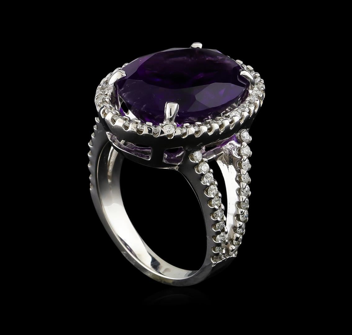 One electronically tested 14KT white gold ladies cast amethyst and diamond ring with a bright polish finish. The featured amethyst is set within a diamond bezel supported by a lattice under gallery and diamond set split shoulders, completed by a two and one-half millimeter wide band. Identified with markings of "14K". Condition is new, good workmanship. Containing: One prong set oval mixed cut natural amethyst, measuring 15.90 x 11.90 x 7.85mm, exact weight 8.32ct., clarity is slightly included, type II, dark, moderately strong, purple color, (GIA P 7/4), cut is good. Transmitting light with a minimum of distortion, transparent. Naturally occurring internal & external characteristics are present. Colored Stone Grading Report attached. Graded in the setting. Seventy-Six prong set round brilliant cut diamonds, measuring 1.40 - 1.30 x 0.81mm exact total weight 76 Stones = 0.70ct. Graded in the setting. Clarity: SI-2 to I-2. Color: F - H. Total Weight of Colored Stones 8.32ct. Total Weight of Diamonds 0.70ct. Total Weight of Ring 8.80gm. AIG Appraised at $3,820.00.