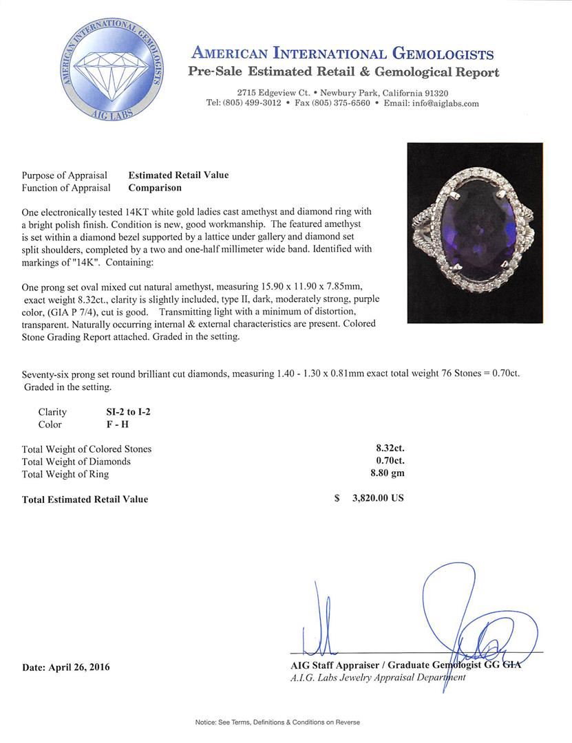 One electronically tested 14KT white gold ladies cast amethyst and diamond ring with a bright polish finish. The featured amethyst is set within a diamond bezel supported by a lattice under gallery and diamond set split shoulders, completed by a two and one-half millimeter wide band. Identified with markings of "14K". Condition is new, good workmanship. Containing: One prong set oval mixed cut natural amethyst, measuring 15.90 x 11.90 x 7.85mm, exact weight 8.32ct., clarity is slightly included, type II, dark, moderately strong, purple color, (GIA P 7/4), cut is good. Transmitting light with a minimum of distortion, transparent. Naturally occurring internal & external characteristics are present. Colored Stone Grading Report attached. Graded in the setting. Seventy-Six prong set round brilliant cut diamonds, measuring 1.40 - 1.30 x 0.81mm exact total weight 76 Stones = 0.70ct. Graded in the setting. Clarity: SI-2 to I-2. Color: F - H. Total Weight of Colored Stones 8.32ct. Total Weight of Diamonds 0.70ct. Total Weight of Ring 8.80gm. AIG Appraised at $3,820.00.