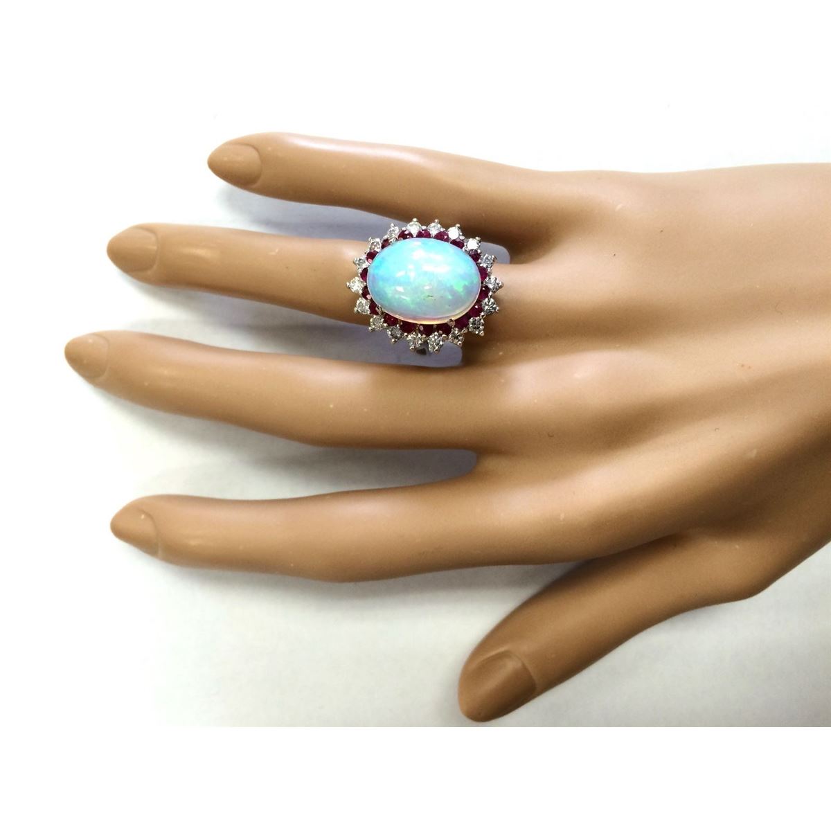 Stamped: 14K Ring Size: 7 Total Ring Weight: 7 Grams Diamond Weight: Total natural diamond weight is 1.13carat. SI1-SI2 clarity / G-H color Gemstone Weight: Total Natural ruby Weight is 1.03ctw Gemstone Weight: Total Natural Opal Weight is 6.17ctw (Measures: 16.83x12.45mm) Main Stone Color: Multi-Color Face Measures: 23.92x20.35mm SKU: [704198]
