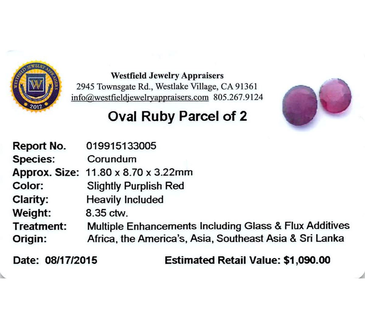 Two oval mixed cut natural rubies, measuring 11.80 x 8.70 x 3.22mm, exact total weight 8.35ct., clarity is heavily included, type II, dark, very slightly brownish, slightly purplish red color, (GIA slpR 7/3), cut is good. Measurements are an average for the pair. Transmitting light somewhat diffusely, transparent to translucent. Naturally occurring internal & external characteristics are present. Indications of laboratory high temperature heat treatment, with glass & flux additives. Ruby has a low tolerance to rhodium plating, repolishing the surface, & ultrasonic cleaning. Westfield Appraised at $1,090.00.