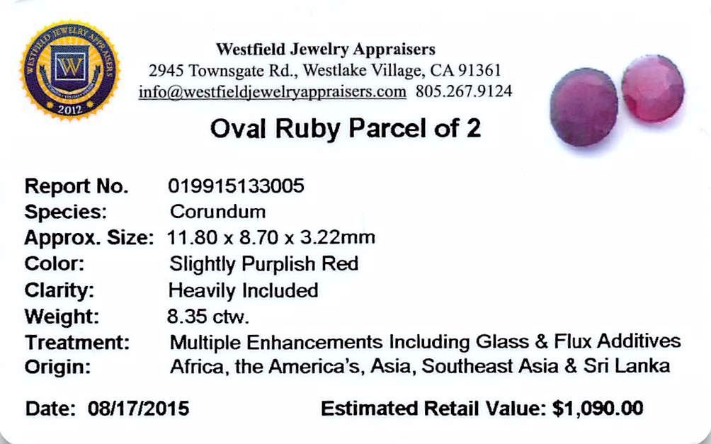 Two oval mixed cut natural rubies, measuring 11.80 x 8.70 x 3.22mm, exact total weight 8.35ct., clarity is heavily included, type II, dark, very slightly brownish, slightly purplish red color, (GIA slpR 7/3), cut is good. Measurements are an average for the pair. Transmitting light somewhat diffusely, transparent to translucent. Naturally occurring internal & external characteristics are present. Indications of laboratory high temperature heat treatment, with glass & flux additives. Ruby has a low tolerance to rhodium plating, repolishing the surface, & ultrasonic cleaning. Westfield Appraised at $1,090.00.