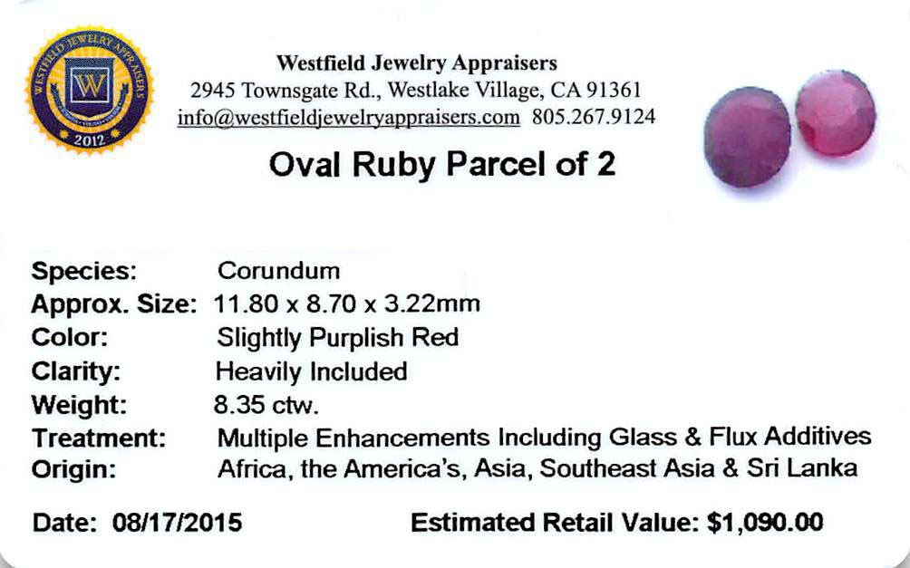 Two oval mixed cut natural rubies, measuring 11.80 x 8.70 x 3.22mm, exact total weight 8.35ct., clarity is heavily included, type II, dark, very slightly brownish, slightly purplish red color, (GIA slpR 7/3), cut is good. Measurements are an average for the pair. Transmitting light somewhat diffusely, transparent to translucent. Naturally occurring internal & external characteristics are present. Indications of laboratory high temperature heat treatment, with glass & flux additives. Ruby has a low tolerance to rhodium plating, repolishing the surface, & ultrasonic cleaning. UGS Appraised at $1,090.00.