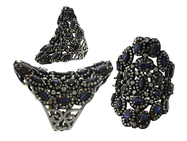 BLUE SAPPHIRE AND DIAMOND DESIGNER RING/Diamond Count 1:/Diamond Total Carat :2.63/Diamond Color & Clarity:J-L/I1-I2 Single Cut /Diamond Count 2:/Diamond 2 CTW:/Diamond Count 3:/Gemstone Count 1:/Gemstone CTW:5.73/Gemstone Dimension:/Gemstone Shape:Oval-Sapphire /Gemstone Count 2:/Gemstone CTW:/Gemstone Shape:/Ring Dimension:/Metal Type 1:14kWhite Gold :Gram Weight:1.28/Metal Type 2:over0.925Sterling Silver / Weight Gram:11.16/Gross Weight :14.04/Ring Size:7.5