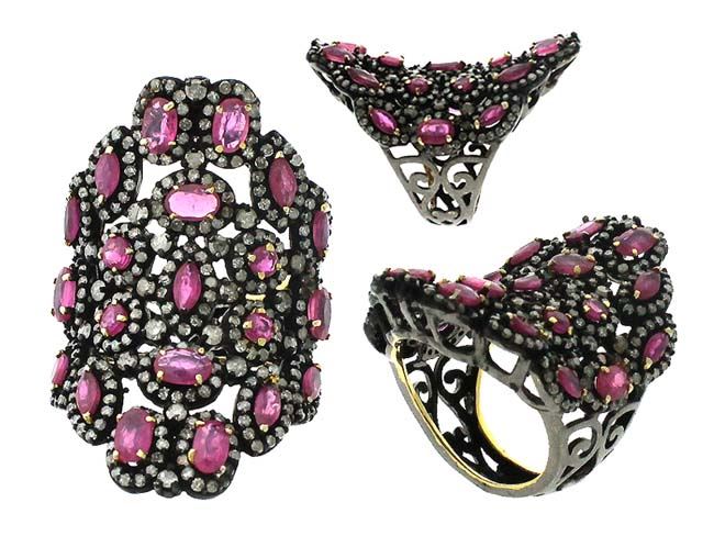 RUBY AND DIAMOND DESIGNER RING/Diamond Count 1:/Diamond Total Carat :2.66/Diamond Color & Clarity:J-L/I1-I2 Single Cut /Diamond Count 2:/Diamond 2 CTW:/Diamond Count 3:/Gemstone Count 1:/Gemstone CTW:5.71/Gemstone Dimension:/Gemstone Shape:Oval-Ruby/Gemstone Count 2:/Gemstone CTW:/Gemstone Shape:/Ring Dimension:/Metal Type 1:14kYellow gold :Gram Weight:1.28/Metal Type 2:over0.925Sterling Silver / Weight Gram:10.82/Gross Weight :16.48/Ring Size:7.5