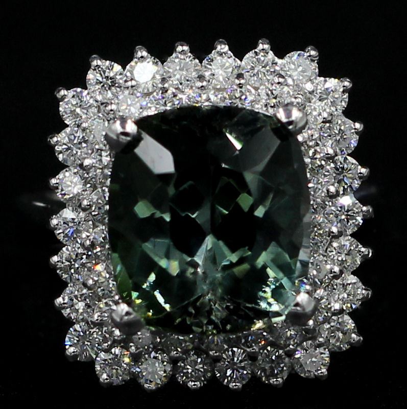 One Oval Cut Natural Green Tourmaline Diamond Band Ring in 14k White Gold. Size is 6.75 but resizable. Ring total carat weight is 8.39 Ct. Setting style if 4 prong with accent diamonds. Total gold weight 8.29 grams. Total stone amount is 49 diamonds and condition is brand new. Main stone is natural and non enhanced. Main stone is 6.95 carats, cushion brilliant shape, fine clarity, fine medium green/blue color, and with excellent cut. Side stones are natural and non-enhanced. Carat weight is 1.44 carats, round brilliant cut, diamond clarity SI, G color, with excellent cut. Total amount of side diamonds: 48. Included with independent certification with a retail value of $11,000.