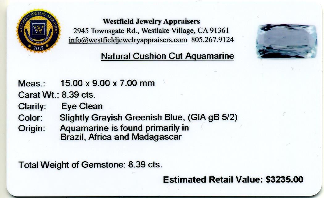 8.39ct Cushion Cut Natural Cushion Cut Aquamarine. Westfield Appraised at $3,235.00.