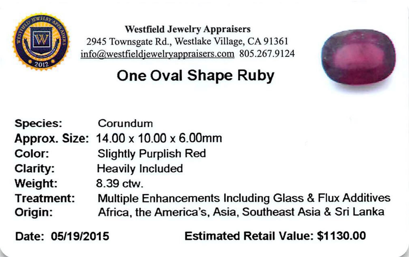 One oval mixed cut natural ruby, measuring 14.00 x 10.00 x 6.00mm, exact weight 8.39ct., clarity is heavily included, type II, medium dark, very slightly brownish, strongly purplish red color, (GIA stpR 6/3), cut is good. Westfield Appraised at $1,130.00.