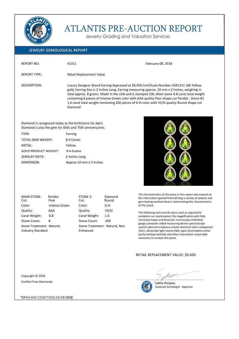 REF-172T2M -41311 ---- 8.4 CTW Peridot & Diamond Halo Earrings 10K Yellow Gold ---- Luxury Designer Brand Earring Appraised at $9,450 Certificate Number US41311 10k Yellow gold, Earring Size is 2 Inches Long, Earring measuring approx. 10 mm x 2 Inches, weighing in total approx. 8 grams. Made in the USA and is stamped 10k, Main stone 6.8 carat total weight containing 8 pieces of Intense Green color with AAA quality Pear shape cut Peridot , Stone #2 1.6 carat total weight containing 200 pieces of G-H color with VS/SI quality Round shape cut Diamond