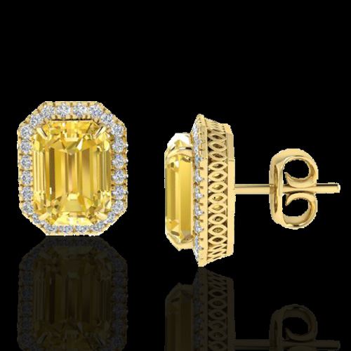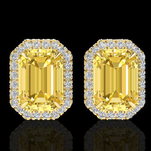 REF-73Y3K -21223 ---- 8.40 CTW Citrine & Micro Pave VS/SI Diamond Halo Earrings 18K Yellow Gold ---- Luxury Designer Brand Earring Appraised at $4,850 Certificate Number US21223 18k Yellow gold, Earring Size is 1/2 Inches, Earring measuring approx. 1/2" X 1/2" , weighing in total approx. 5 grams. Made in the USA and is stamped 18k, Main stone 8 carat total weight containing 2 pieces of Translucent Yellow color with AAA quality Emerald shape cut Citrine , Stone #2 0.4 carat total weight containing 50 pieces of H-I color with VS/SI quality Round shape cut Diamond