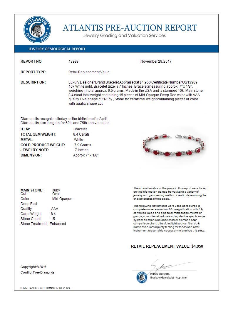 REF-69A3X -13989 ---- 8.40 CTW Ruby Bracelet 10K White Gold ---- Luxury Designer Brand Bracelet Appraised at $4,950 Certificate Number US13989 10k White gold, Bracelet Size is 7 Inches, Bracelet measuring approx. 7" x 1/8", weighing in total approx. 6.5 grams. Made in the USA and is stamped 10k, Main stone 8.4 carat total weight containing 15 pieces of Mid-Opaque-Deep Red color with AAA quality Oval shape cut Ruby , Stone #2 carat total weight containing pieces of color with quality shape cut