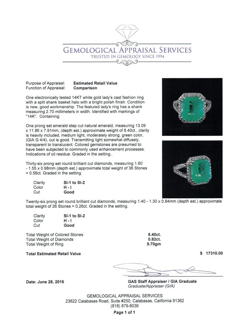 One electronically tested 14KT white gold lady's cast fashion ring with a split shank basket halo with a bright polish finish. The featured lady's ring has a shank measuring 2.70 millimeters in width. Identified with markings of "14K". Condition is new, good workmanship. Containing: One prong set emerald step cut natural emerald, measuring 13.09 x 11.86 x 7.91mm, (depth est.) approximate weight of 8.40ct., clarity is heavily included, medium light, moderately strong, green color, (GIA G 4/4), cut is good. Transmitting light somewhat diffusely, transparent to translucent. Colored gemstones are presumed to have been subjected to commonly used enhancement processes. Indications of oil residue. Graded in the setting. Thirty-Six prong set round brilliant cut diamonds, measuring 1.60 - 1.55 x 0.98mm (depth est.) approximate total weight of 36 Stones = 0.56ct. Graded in the setting. Clarity: SI-1 to SI-2. Color: H - I. Cut Good Twenty-Six prong set round brilliant cut diamonds, measuring 1.40 - 1.30 x 0.84mm (depth est.) approximate total weight of 26 Stones = 0.26ct. Graded in the setting. Clarity: SI-1 to SI-2. Color: H - I. Cut Good. Total Weight of Colored Stones 8.40ct. Total Weight of Diamonds 0.82ct. Total Weight of Ring 9.70gm. GAS Appraised at $17,310.00.