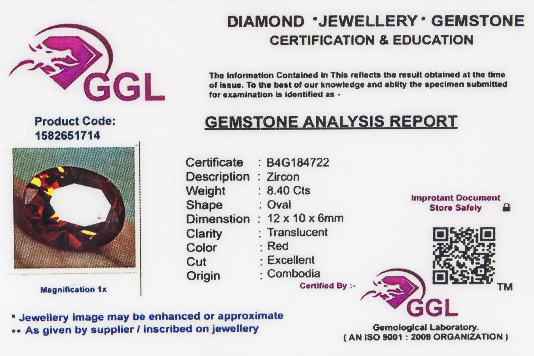 One (1) 8.40 ct oval cut red zircon gemstone. 12 x 10 x 6 mm. Accompanied with GGL certificate.