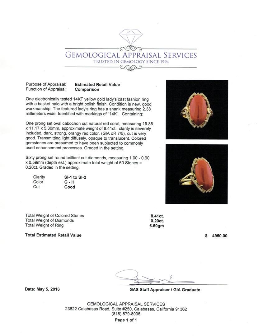 One electronically tested 14KT yellow gold lady's cast fashion ring with a basket halo with a bright polish finish. The featured lady's ring has a shank measuring 2.38 millimeters wide. Identified with markings of "14K". Condition is new, good workmanship. Containing: One prong set oval cabochon cut natural red coral, measuring 19.85 x 11.17 x 5.30mm, approximate weight of 8.41ct., clarity is severely included, dark, strong, orangy red color, (GIA oR 7/5), cut is very good. Transmitting light diffusely, opaque to translucent. Colored gemstones are presumed to have been subjected to commonly used enhancement processes. Graded in the setting. Sixty prong set round brilliant cut diamonds, measuring 1.00 - 0.90 x 0.59mm (depth est.) approximate total weight of 60 Stones = 0.20ct. Graded in the setting. Clarity: SI-1 to SI-2. Color: G - Good. Total Weight of Colored Stones 8.41ct. Total Weight of Diamonds 0.20ct. Total Weight of Ring 6.60gm GAS Appraised at $4,950.00.