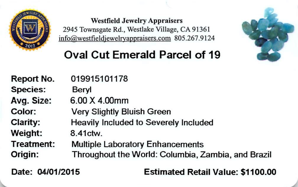 Nineteen oval mixed cut natural emeralds exact total weight 8.41ct., clarity is heavily included, type III, medium dark, very slightly grayish, very slightly bluish green color, (GIA vslbG 6/3), cut is good. Westfield Appraised at $1,100.00.