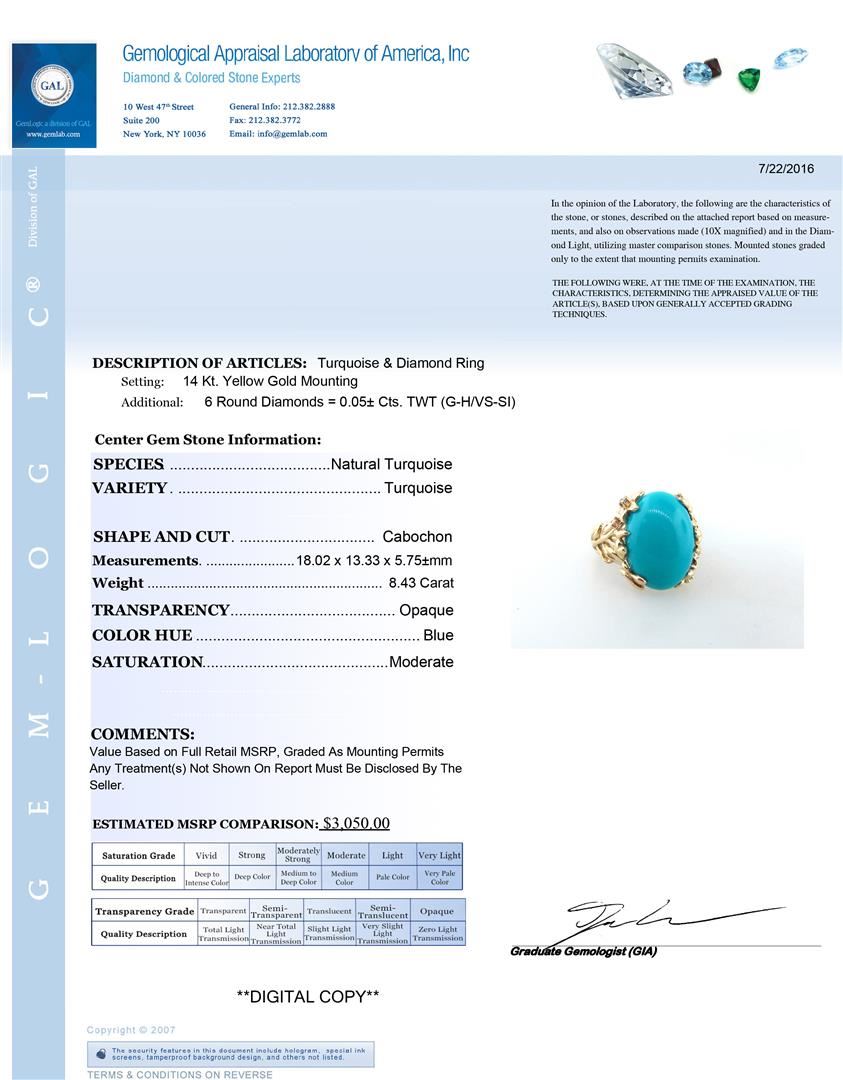 One Turquoise and Diamond Ring. Setting: 14 Kt. yellow gold mounting. Additional: 6 Round Diamonds = 0.05 Cts. TWT (G-H/VS-SI). Center Gem Stone Information: Species: natural turquoise. Variety: turquoise. Shape and Cut: cabochon. Measurements: 18.02 x 13.33 x 5.75 mm. Weight: 8.43 Carats. Transparency: opaque. Color Hue: Blue. Saturation: Moderate. Total Weight: 5.68 grams.