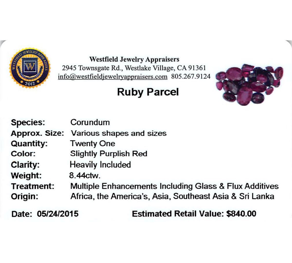 Twenty-one various shapes & sizes cut natural rubies exact total weight 8.44ct., clarity is heavily included, type II, dark, very slightly brownish, slightly purplish red color, (GIA slpR 7/3), cut is good. Transmitting light somewhat diffusely, transparent to translucent. Naturally occurring internal & external characteristics are present. Indications of laboratory high temperature heat treatment, with glass & flux additives. Ruby has a low tolerance to rhodium plating, repolishing the surface, & ultrasonic cleaning. Westfield Appraised at $840.00.