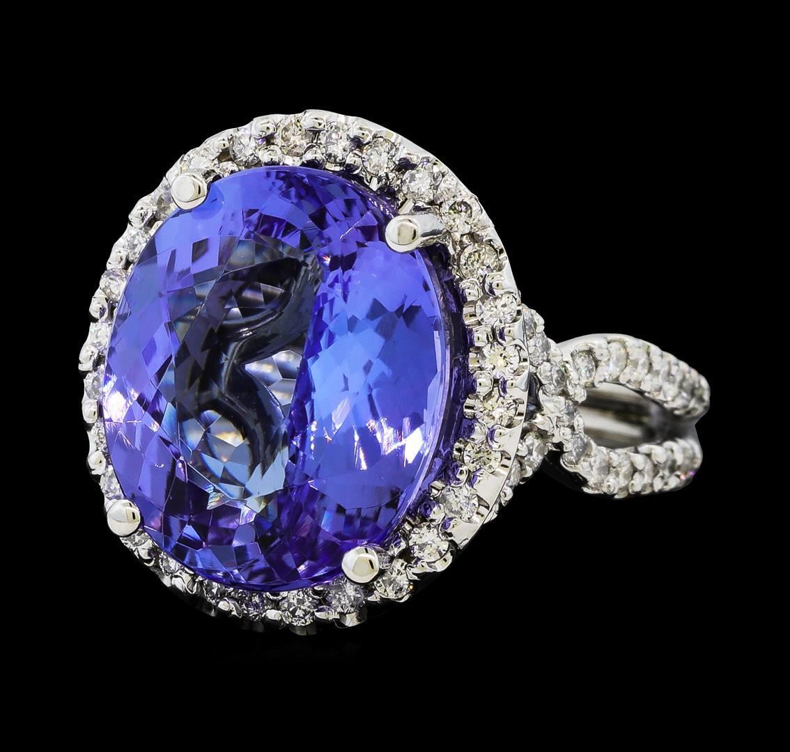 One electronically tested 14KT white gold lady's cast fashion ring with a crossover shank basket halo with a bright polish finish. The featured lady's ring has a double shank measuring 3.15 millimeters wide. Identified with markings of '14K'. Condition is new, good workmanship. Containing: One prong set oval modified brilliant cut natural tanzanite, measuring 14.14 x 11.90 x 6.70mm, (depth est.) 6%. bulge factor, approximate weight of 8.44ct., clarity is eye clean, medium, very slightly grayish, violetish blue color, (GIA vB 5/3), cut is very good. Transmitting light with no distortion, transparent. Colored gemstones are presumed to have been subjected to commonly used enhancement processes. Graded in the setting. Seventy-Four prong set round brilliant cut diamonds, measuring 1.40 - 1.35 x 0.86mm (depth est.) approximate total weight of 74 Stones = 0.73ct. Graded in the setting. Clarity SI-1 to I-1. Color: G - H Cut Good. Total Weight of Colored Stones 8.44ct.. Total Weight of Diamonds 0.73ct.. Total Weight of Ring 7.50gm. GAS Appraised.