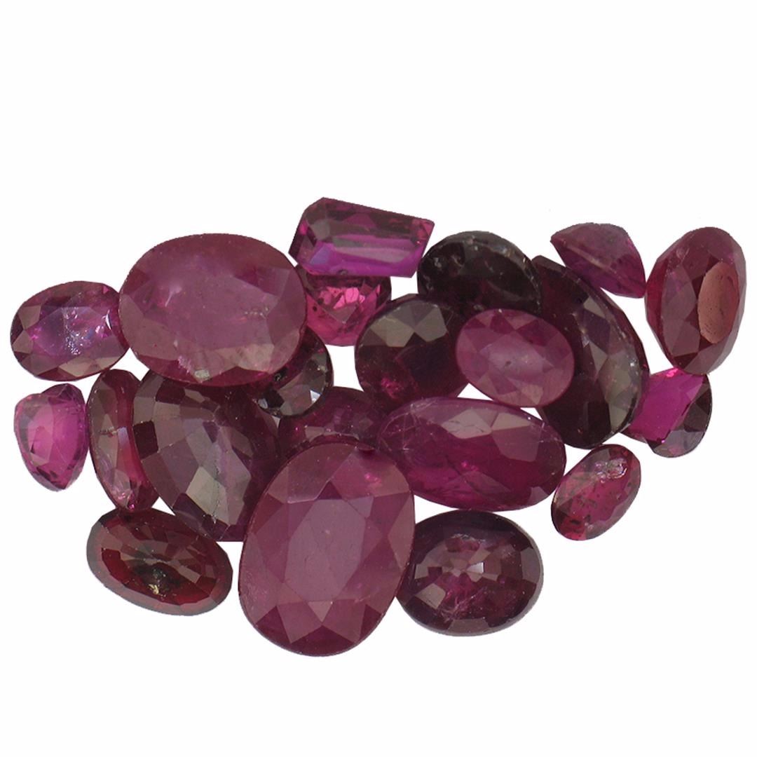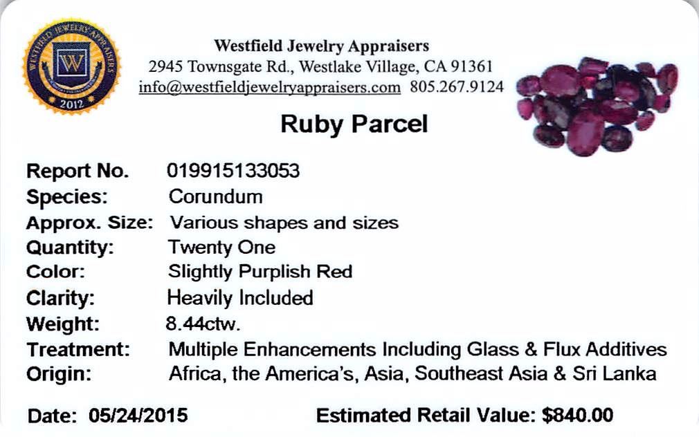 Twenty-one various shapes & sizes cut natural rubies exact total weight 8.44ct., clarity is heavily included, type II, dark, very slightly brownish, slightly purplish red color, (GIA slpR 7/3), cut is good. Transmitting light somewhat diffusely, transparent to translucent. Naturally occurring internal & external characteristics are present. Indications of laboratory high temperature heat treatment, with glass & flux additives. Ruby has a low tolerance to rhodium plating, repolishing the surface, & ultrasonic cleaning. Westfield Appraised at $840.00.