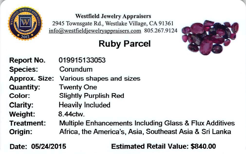 Twenty-one various shapes & sizes cut natural rubies exact total weight 8.44ct., clarity is heavily included, type II, dark, very slightly brownish, slightly purplish red color, (GIA slpR 7/3), cut is good. Transmitting light somewhat diffusely, transparent to translucent. Naturally occurring internal & external characteristics are present. Indications of laboratory high temperature heat treatment, with glass & flux additives. Ruby has a low tolerance to rhodium plating, repolishing the surface, & ultrasonic cleaning. Westfield Appraised at $840.00.
