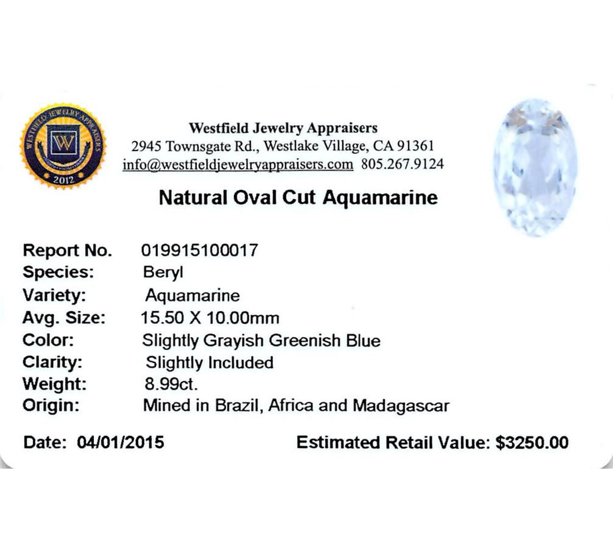 One oval cut natural aquamarine exact weight 8.44ct., clarity is slightly included, type I, medium, slightly grayish, very slightly greenish blue color, (GIA vslgB 5/2), cut is good. Westfield Appraised at $3,250.00.