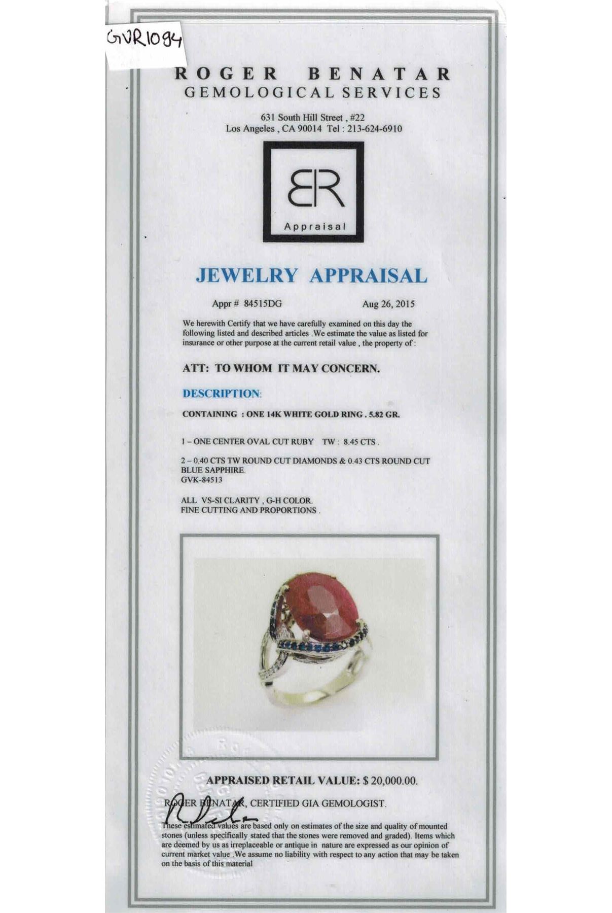 14K WHITE GOLD NATURAL RUBY RING : 5.82 GRAMS / DIAMOND : 0.40CT / NATURAL CEYLON BLUE SAPPHIRE : 0.43CT / NATURAL RUBY : 8.45CT / #GVR1094 **This stunning 8.45ct center Oval Cut Ruby steals the breath with the pure awe of its deep red hue. Rubies impart a feeling of power to the wearer, improving self confidence and adventurousness. Surrounded by twinkling 0.40ct Round Cut Diamonds and 0.43ct Blue Sapphire, this cocktail ring is an investment piece, set in a warm 14k white gold.**