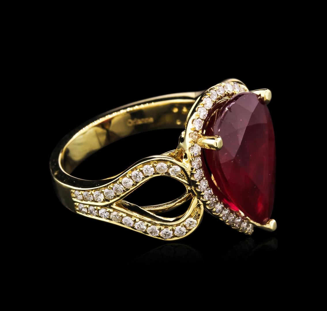 One 14KT yellow gold ruby and diamond ring. A pear cut ruby corundum gemstone is prong mounted in the center of the ring. Round brilliant cut diamonds accent the ring around the center gemstone and on both sides. The ring is cast stamped "14K" and has a gross weight of 8.60 grams. Gemstone(s): Stone: Ruby corundum. Nature: Natural. Shape: Pear, faceted. Quantity: 1 , mounted. Weight: 8.45ct. Dimensions: 15.46 x 10.40mm. Bulge: Visible. Clarity: I1, Type 2. Color: Red (5/5). Symmetry: Very good. Color Intensity: Medium. Transparency: Transparent. Tone: Dark. Enhancements: Indications of high temperature heat treatment, with glass and flux additives. Diamond(s): Shape: Round brilliant cut. Weight: 0.68ct. Average Clarity: I1-I2. Average Color: H-J. Symmetry: Very good. Polish: Very good. GGA Appraised at $7,935.00.