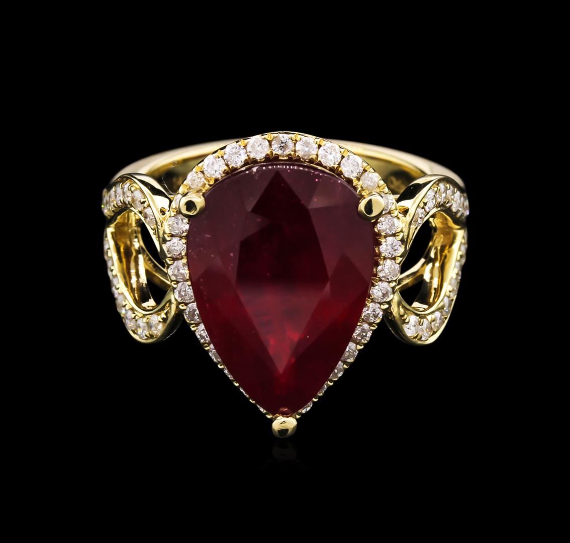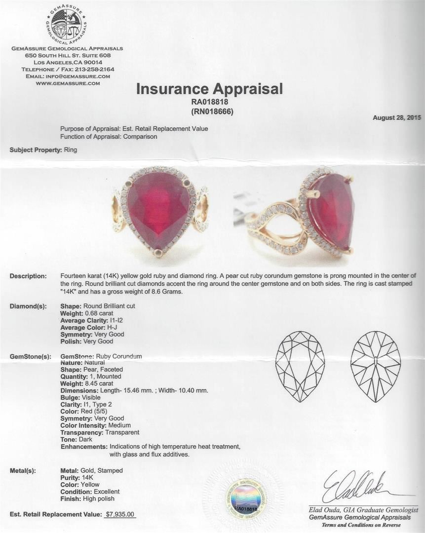 One 14KT yellow gold ruby and diamond ring. A pear cut ruby corundum gemstone is prong mounted in the center of the ring. Round brilliant cut diamonds accent the ring around the center gemstone and on both sides. The ring is cast stamped "14K" and has a gross weight of 8.60 grams. Gemstone(s): Stone: Ruby corundum. Nature: Natural. Shape: Pear, faceted. Quantity: 1 , mounted. Weight: 8.45ct. Dimensions: 15.46 x 10.40mm. Bulge: Visible. Clarity: I1, Type 2. Color: Red (5/5). Symmetry: Very good. Color Intensity: Medium. Transparency: Transparent. Tone: Dark. Enhancements: Indications of high temperature heat treatment, with glass and flux additives. Diamond(s): Shape: Round brilliant cut. Weight: 0.68ct. Average Clarity: I1-I2. Average Color: H-J. Symmetry: Very good. Polish: Very good. GGA Appraised at $7,935.00.