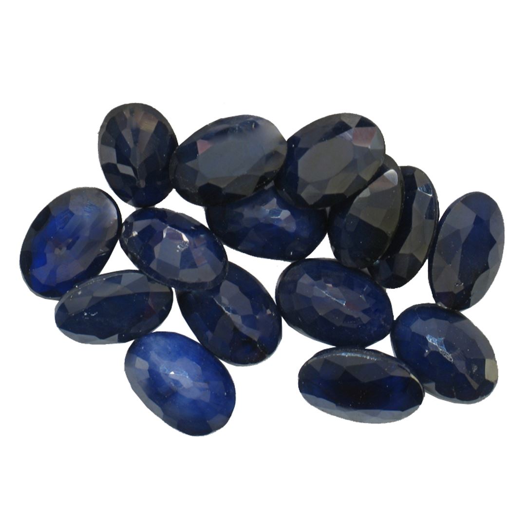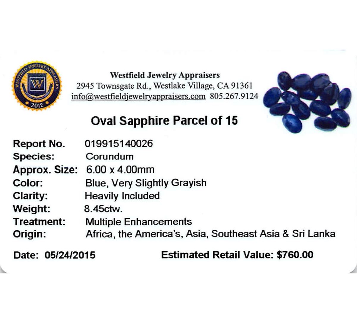 Fifteen oval mixed cut natural blue sapphires, measuring 6.00 x 4.00 x 0.00mm, exact total weight 8.45ct., clarity is heavily included, type II, dark, very slightly grayish, blue color, (GIA B 7/3), cut is good. Indications of multiple laboratory enhancements, including high temperature heat treatment. Westfield Appraised at $760.00.