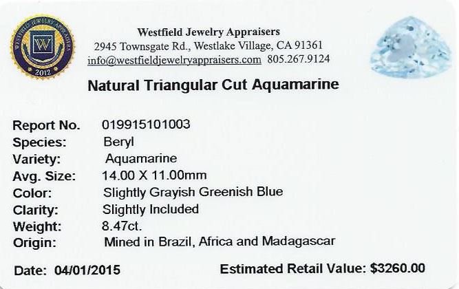 One triangle cut natural aquamarine exact weight 8.47ct., clarity is slightly included, type I, medium light, very slightly grayish, very slightly greenish blue color, (GIA vslgB 4/3), cut is good. Westfield Appraised at $3,260.00.