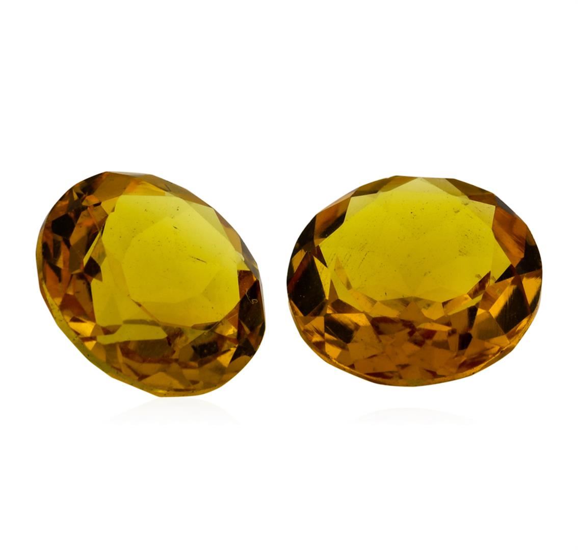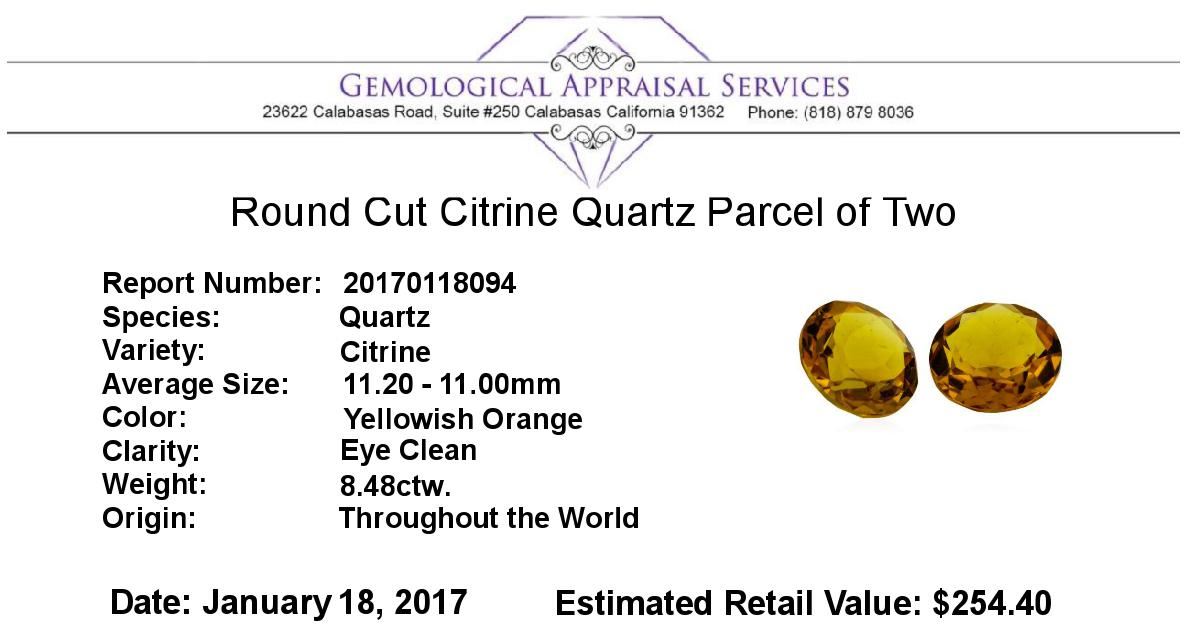 One natural round cut citrine quartz parcel of two with an exact weight of 8.48ctw., clarity is eye clean, yellowish orange. Gemological Appraisals Services estimates the retail value at $254.4 GAS Appraised.
