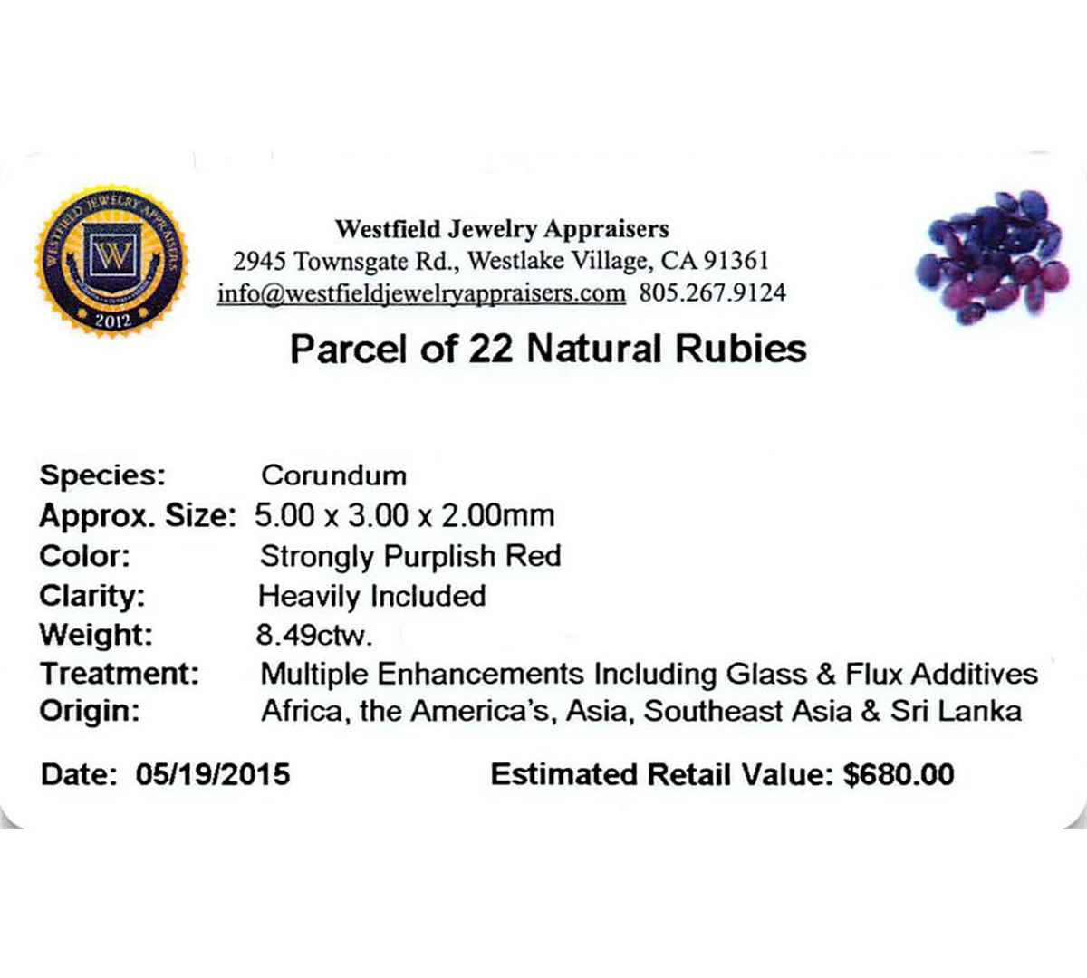 Twenty-two various shapes & sizes cut natural rubies, measuring 5.00 x 3.00 x 2.00mm, exact total weight 8.49ct., clarity is heavily included, type II, very dark, very slightly brownish, strongly purplish red color, (GIA stpR 8/3), cut is good. Measurements are an average for the group. Transmitting light somewhat diffusely, transparent to translucent. Naturally occurring internal & external characteristics are present. Indications of laboratory high temperature heat treatment, with glass & flux additives. Ruby has a low tolerance to rhodium plating, repolishing the surface, & ultrasonic cleaning. Westfield Appraised at $680.00.